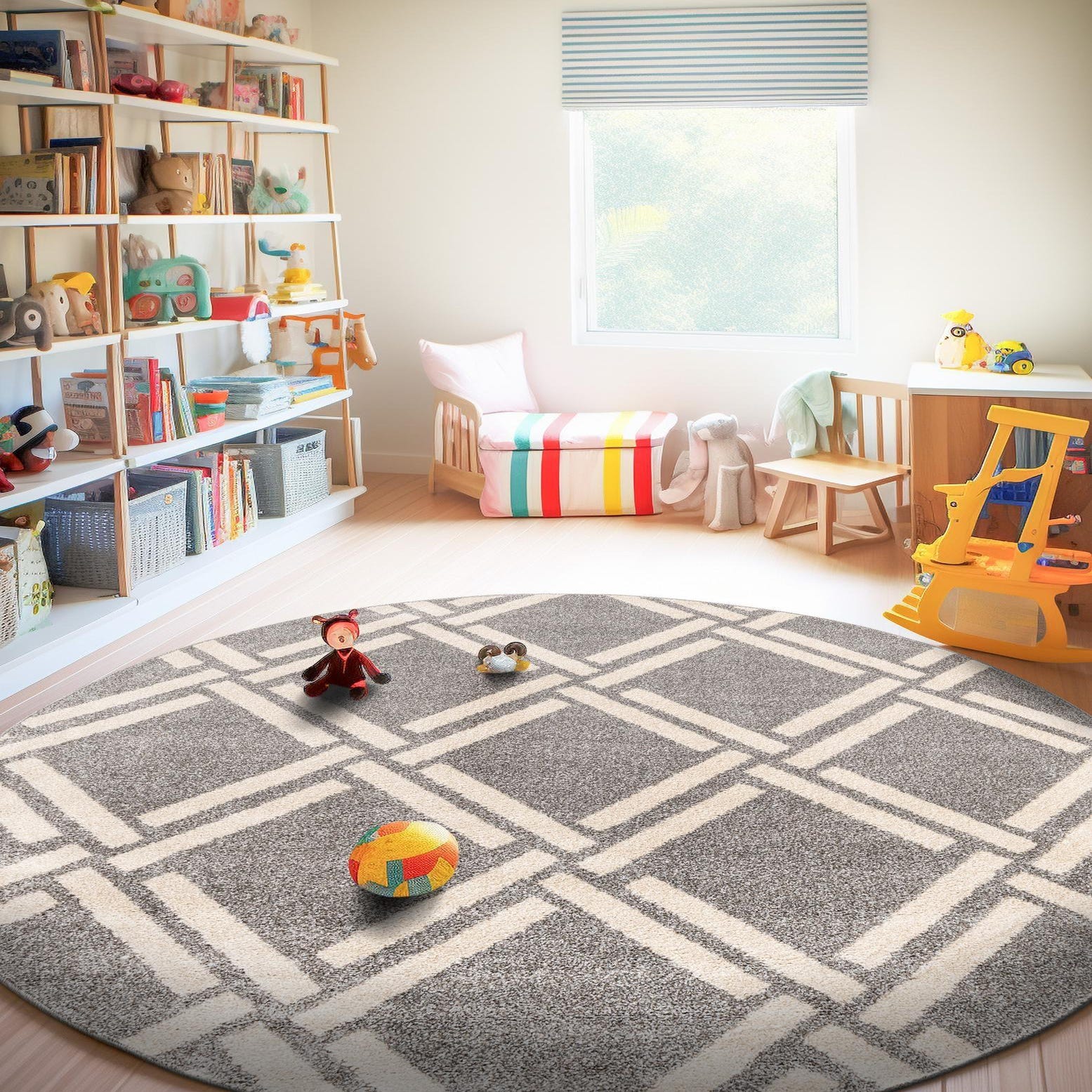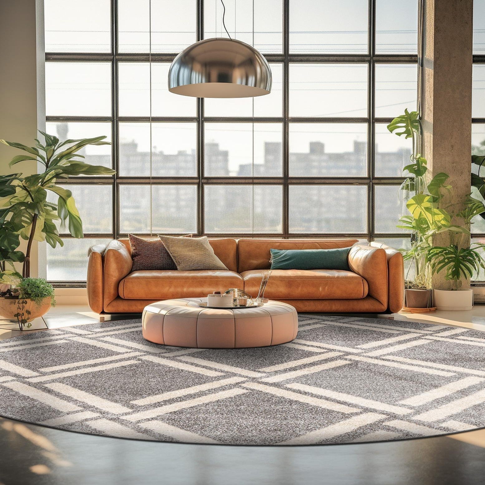 Place this round rug to anchor a seating area or beneath a circular dining table to define the zone and introduce pattern. It pairs well with mid-century modern furnishings, contemporary neutral interiors, or transitional schemes that mix warm wood tones and cool metals. Use it in a living room, home office, or bedroom to add structure and soft texture while keeping the palette calm and coordinated.