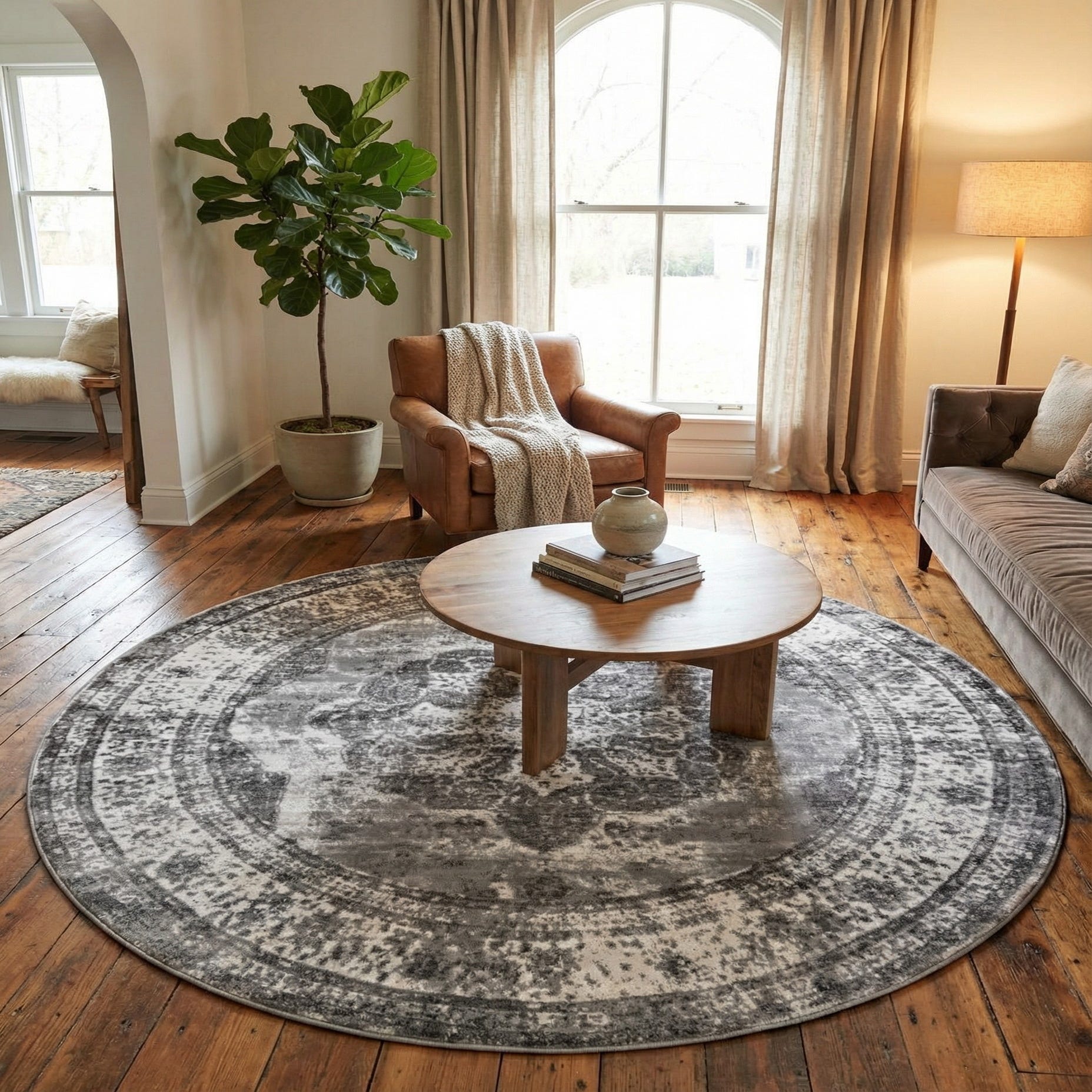 A muted gray field sets a calm foundation for a softened traditional medallion motif rendered in beige highlights. The pattern has a gently distressed finish that blends floral and geometric details into a faded, antique-inspired look, with concentric banding around the edge that adds subtle definition without sharp contrast. The overall effect is a lived-in, layered aesthetic that brings quiet pattern and tonal depth to a room.