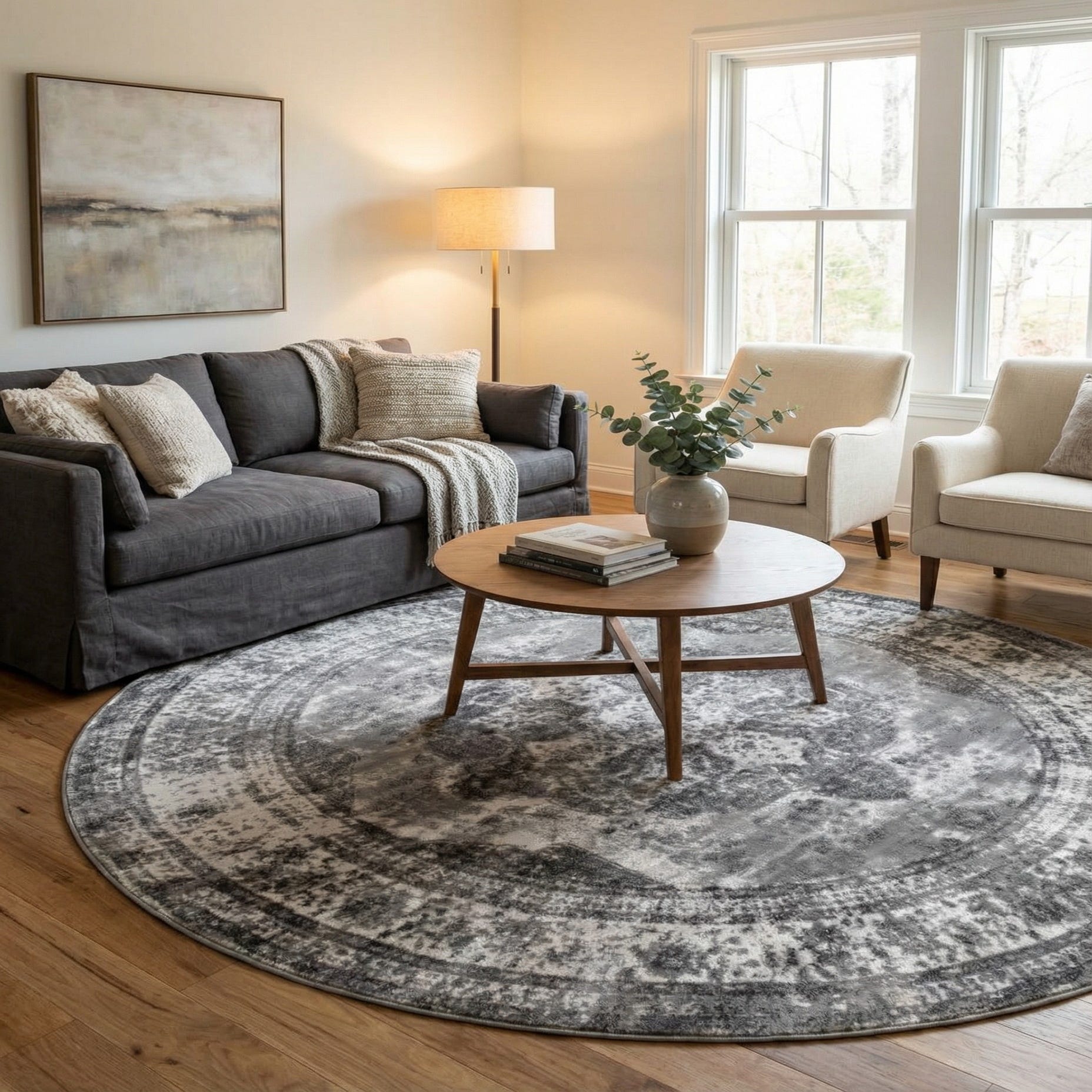 Machine made of 100% polypropylene, the rug has a low pile with a smooth, slightly velvety hand that feels comfortable beneath bare feet. Its construction makes it well-suited for everyday spaces — place it beneath a round dining table to anchor seating, center it in a living room seating group to soften contemporary furnishings, or use it in a bedroom to add a neutral, textural layer. Pair with light wood or metal furniture and linen upholstery for a modern-meets-traditional look, or combine with warm leathers and woven accents for a relaxed, transitional vibe.