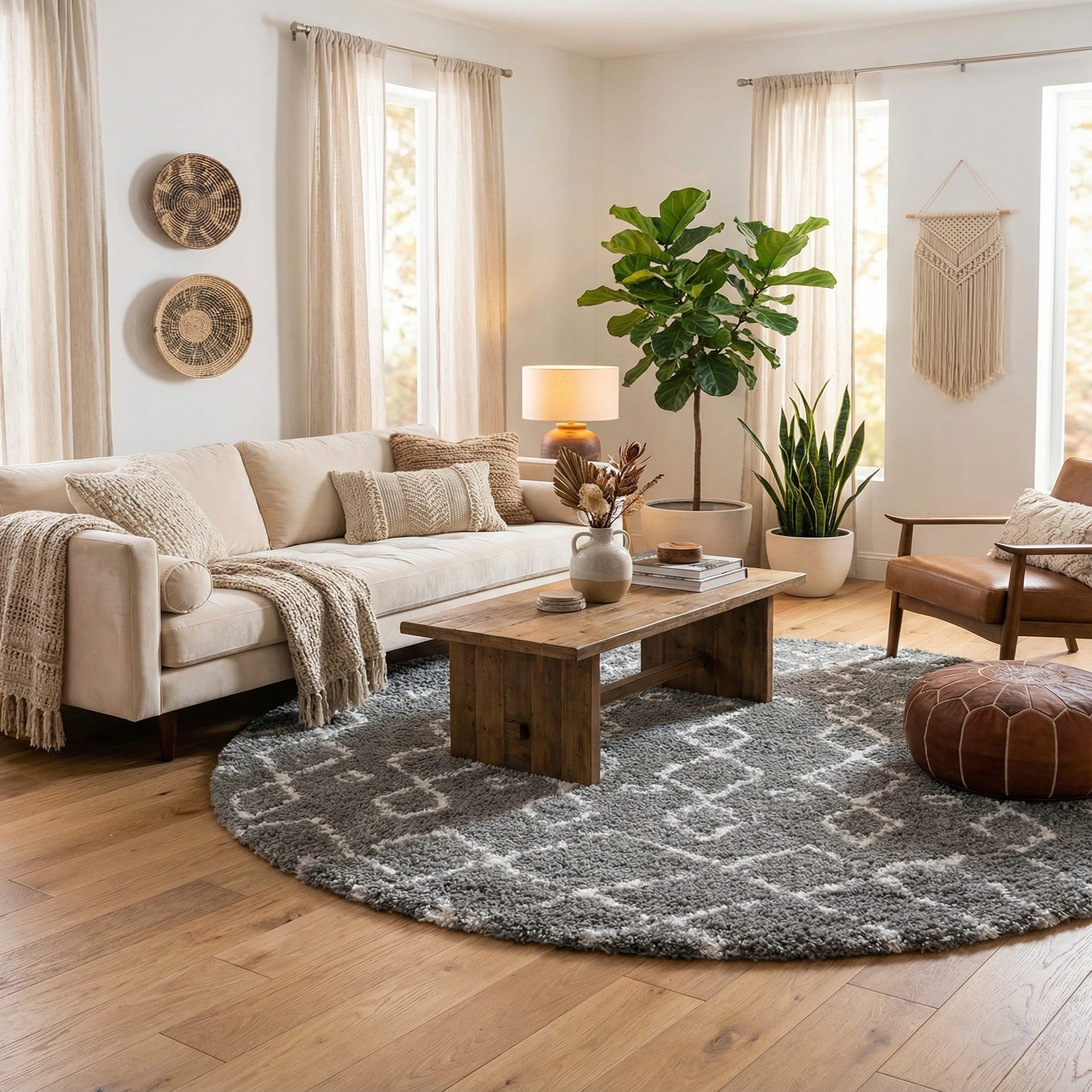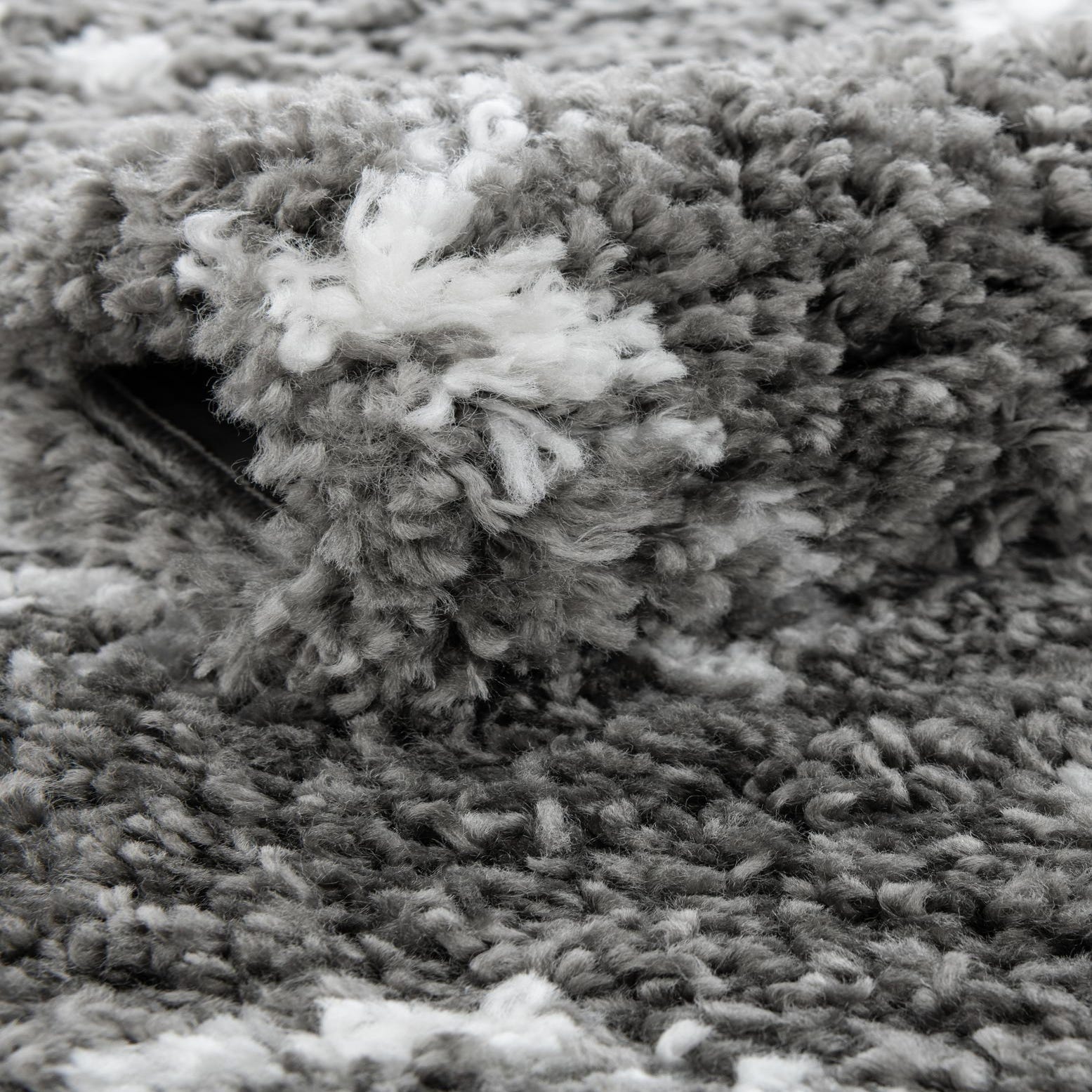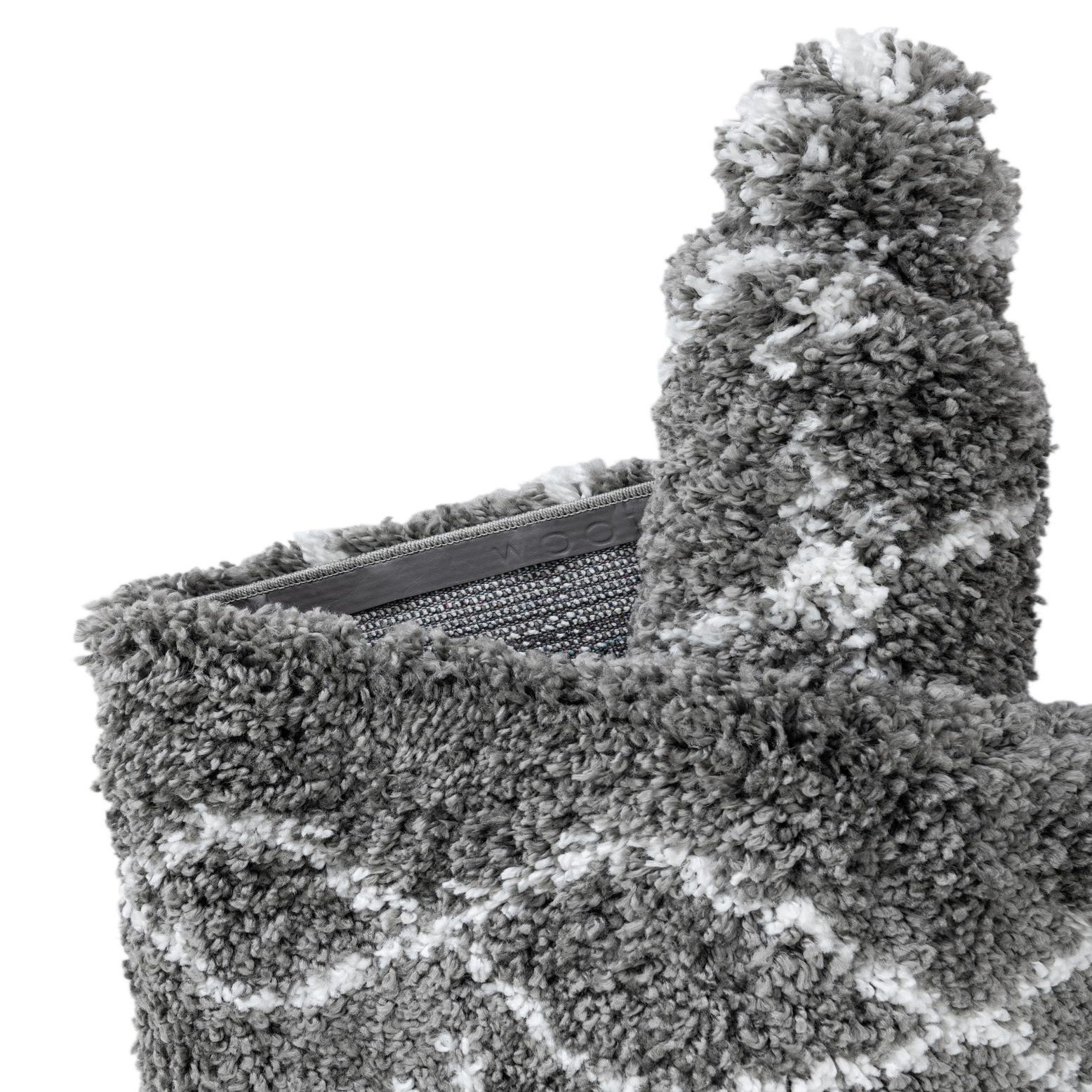 A soft, shag pile in a medium-high profile gives this round rug a plush, cushioned feel underfoot. The background is a steady gray, while an irregular, hand-drawn diamond lattice and scattered geometric accents are rendered in ivory for a subtle contrast that remains visually calm. The pattern has a Moroccan-inspired look with slightly uneven lines and diamonds that create movement without overwhelming a room.
