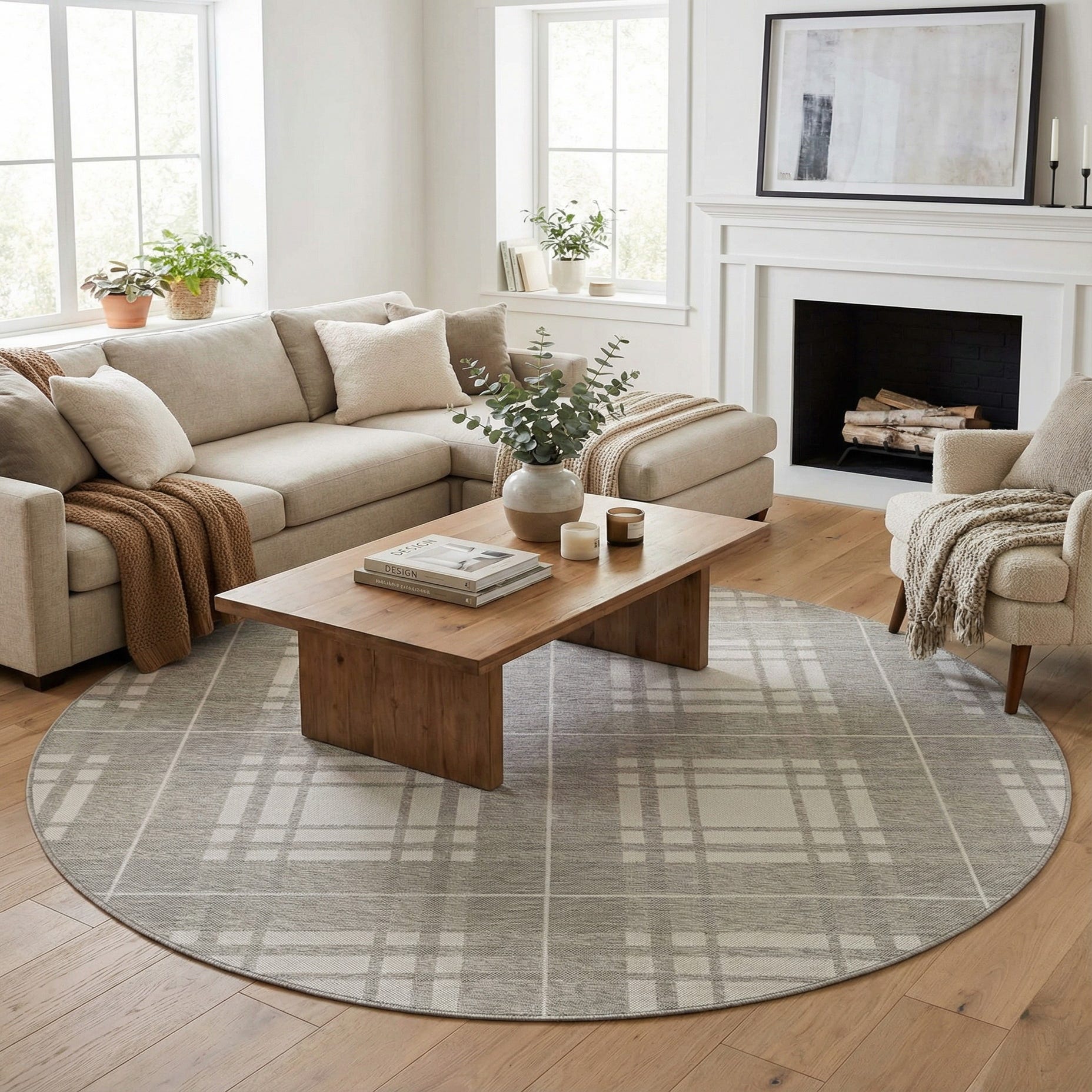 This round, machine-made rug is constructed from 100% polypropylene and has a low-profile, tightly woven texture that feels firm underfoot. A soft gray ground is patterned with an oversized check in layered bands of taupe and ivory, creating a structured, modern-plaid look. The flat-woven surface shows subtle striations that add visual depth without raising the pile, giving the piece a composed, casual presence.