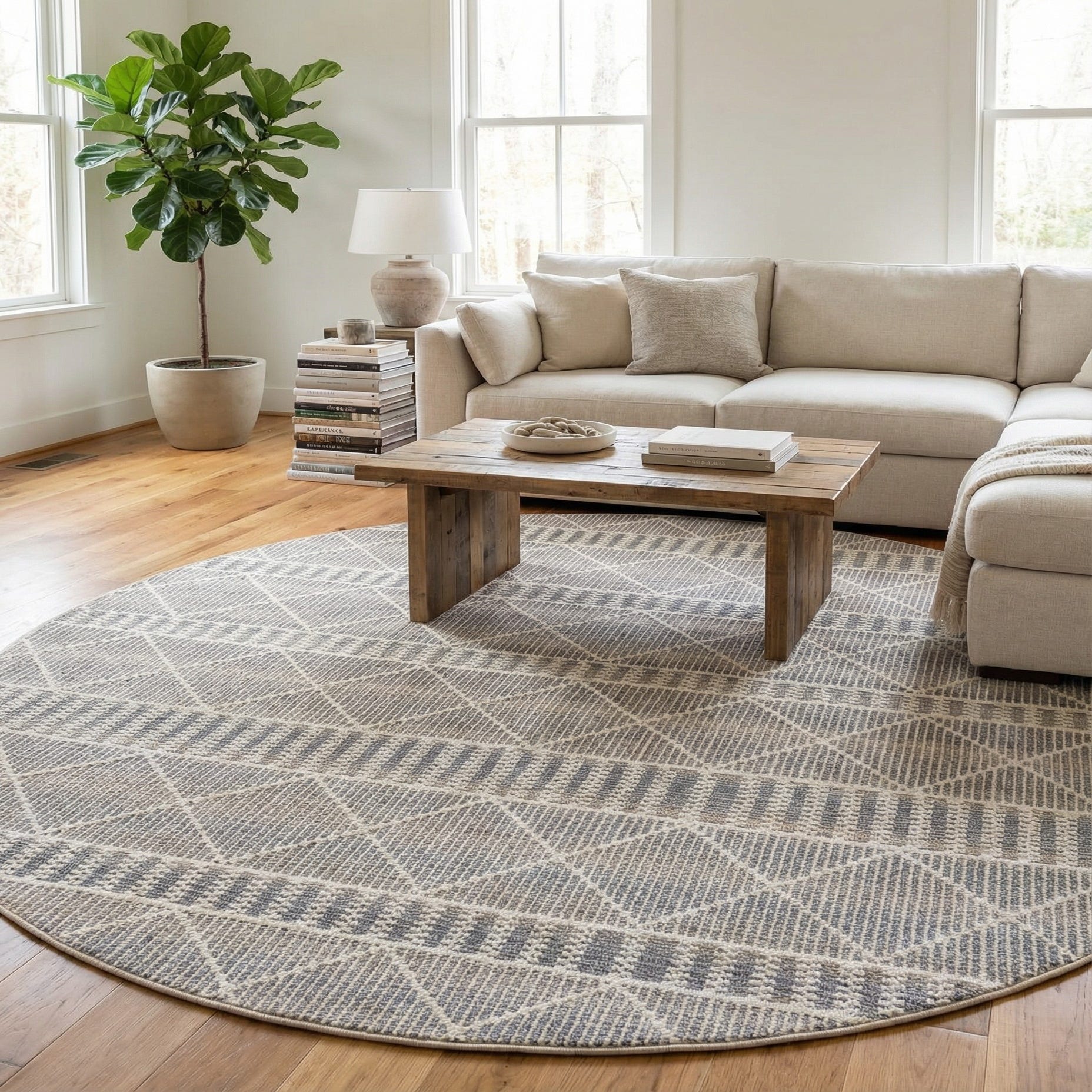 Machine-made from 100% polypropylene, the rug has a low, slightly textured pile that feels firm underfoot and lays flat for a neat silhouette. Its neutral palette and geometric layout make it a good fit for a covered patio, sunroom, or casual dining area, and it pairs well with wicker or metal patio furniture, light wood tones, and linen textiles. For indoor use, it anchors a modern coastal or transitional living space, complementing simple sofas, natural accent pieces, and layered throws.