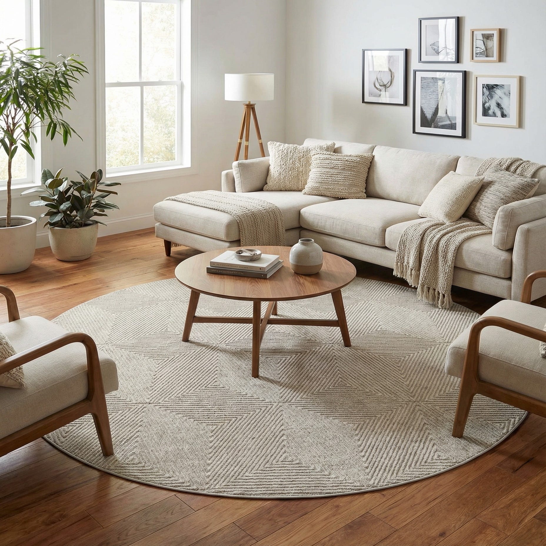 A 7' 10 round gray modern rug with a geometric triangle pattern, suitable for indoor or outdoor spaces.