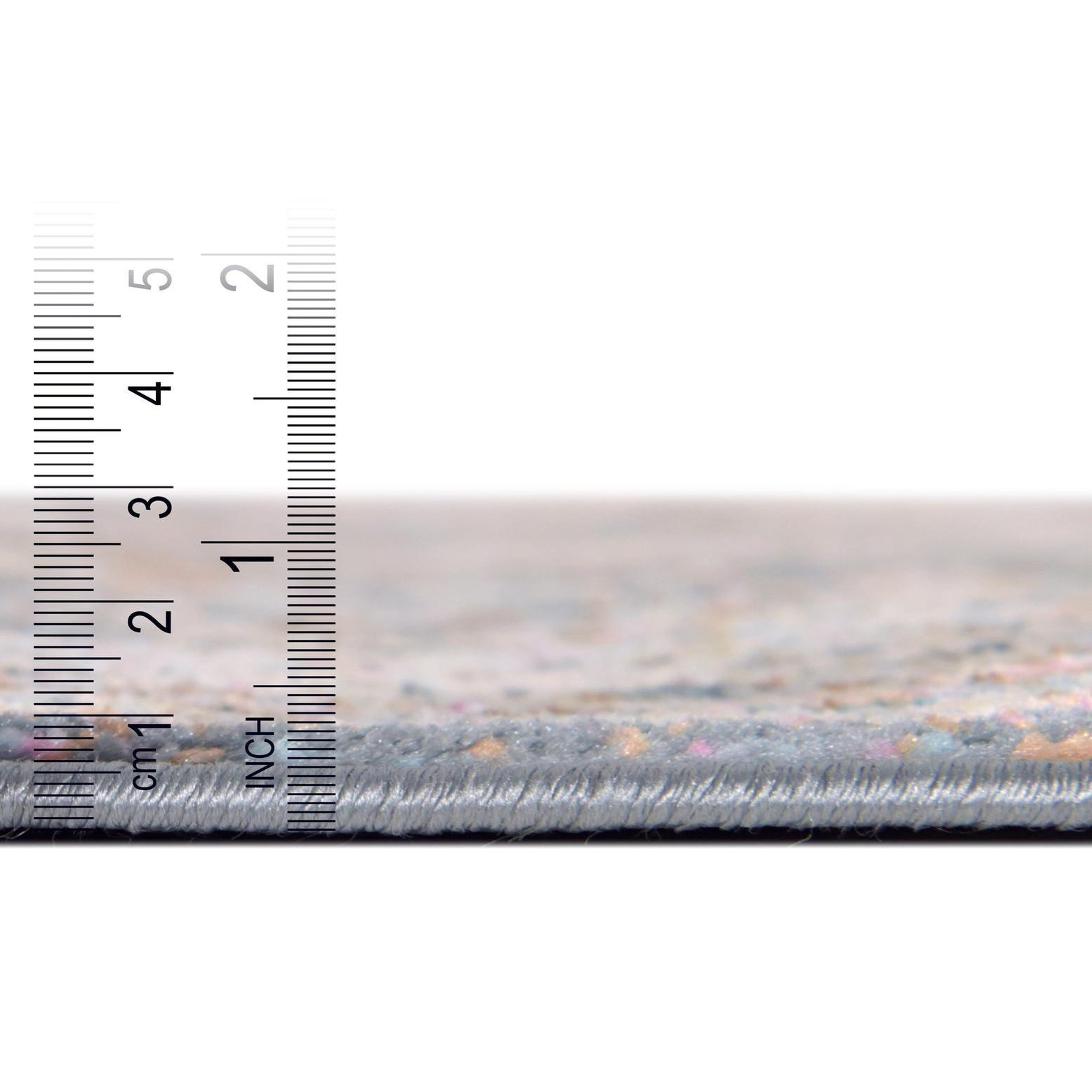 A classic medallion layout and ornamental border give this round rug a traditional, slightly aged look with clear, layered detailing across the surface. The gray background anchors the design while blue, gold and ivory accents trace the central motif and scrolling border, creating a balanced contrast between cool and warm tones. The pattern reads like a timeworn heirloom—delicate flourishes and geometric forms blend into a deliberately distressed finish that adds visual depth without overpowering a room.
