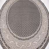 A round gray Southwestern rug featuring a central geometric pattern surrounded by borders with tribal motifs and elephant figures.