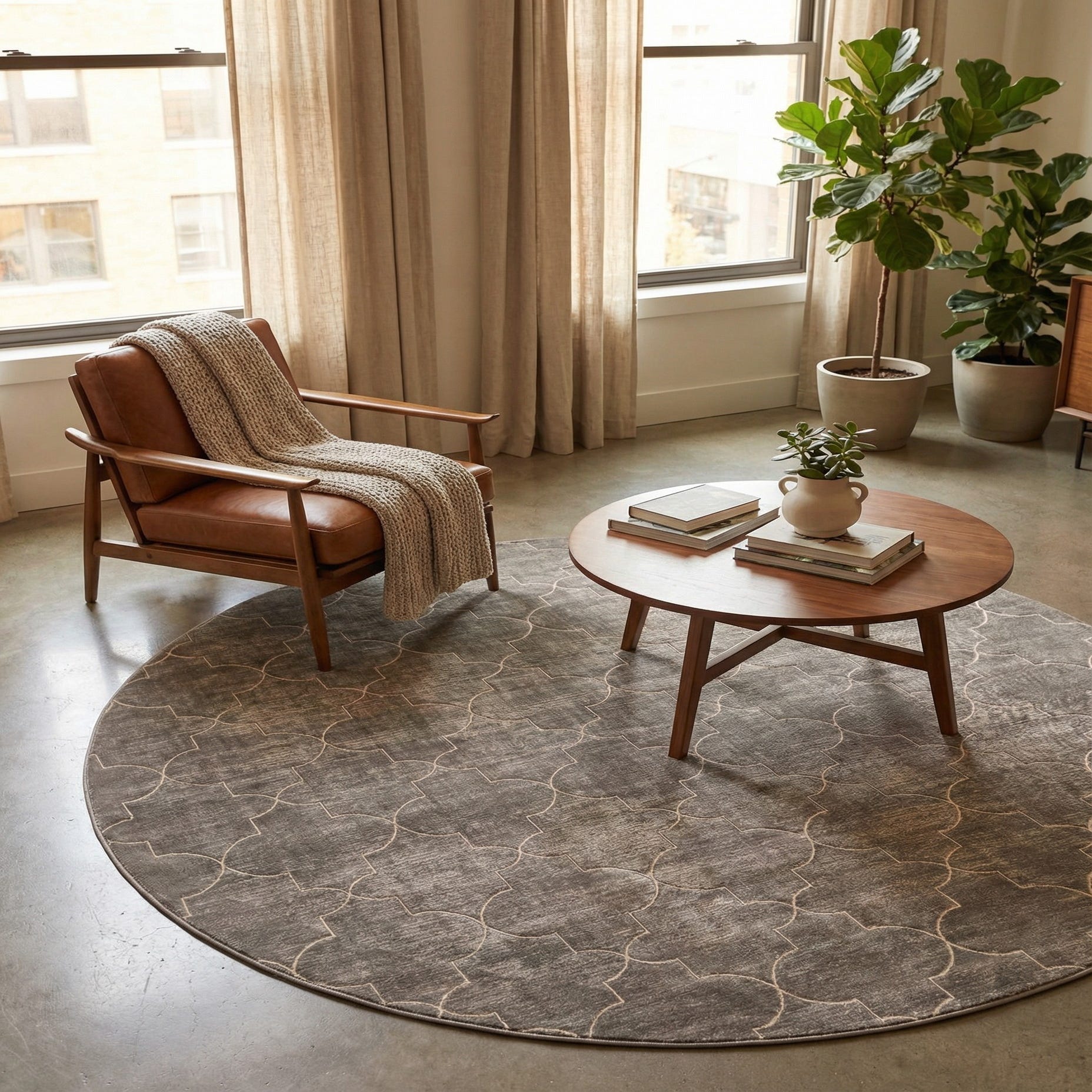 The Uptown Collection offers a sophisticated addition to any space with its 8 Ft Round rug, machine woven of a durable blend of 70% Polypropylene and 30% Polyester. This piece features a harmonious pattern of interlocking trellis motifs in contrasting shades of gray and ivory, set against a calm gray background. The mixture of materials conveys a subtle sheen and a soft, inviting texture underfoot.
