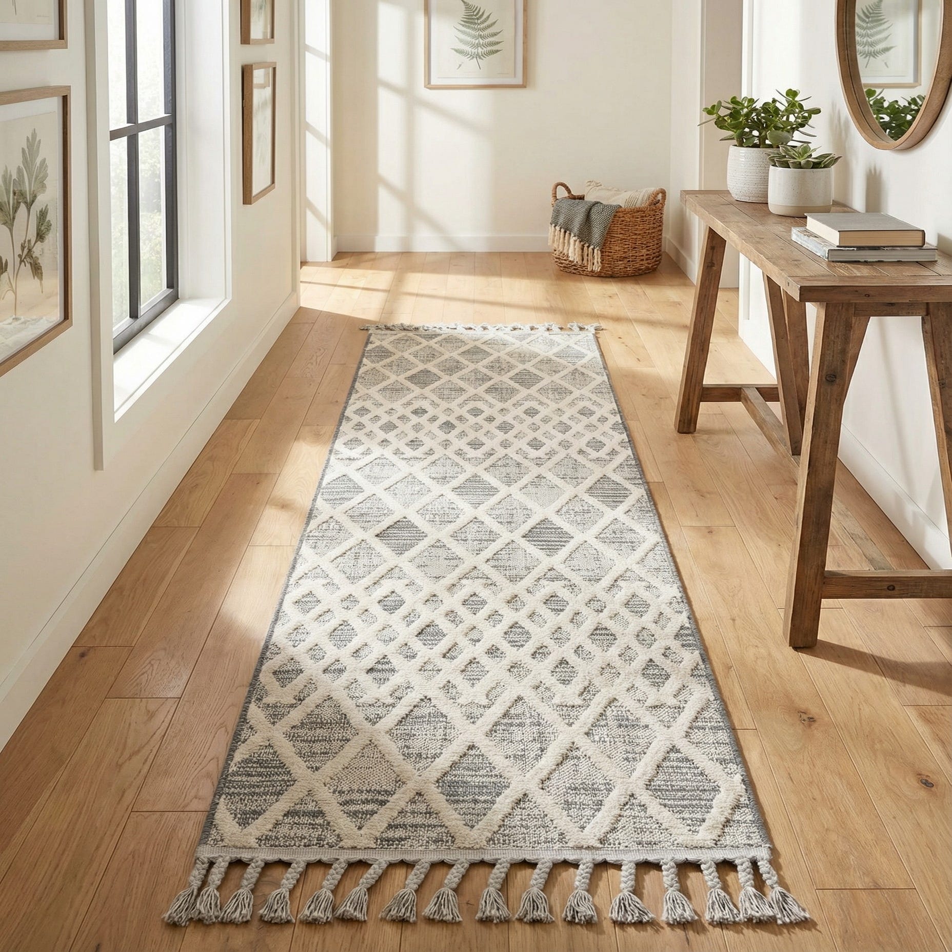 Designed for narrow passages and compact spaces, this runner brings quiet pattern and texture to hallways, entryways, and kitchen aisles. It pairs naturally with Scandinavian and modern farmhouse interiors—think light wood floors, clean-lined furnishings, and soft textiles—but also suits transitional or contemporary schemes where a neutral, textural anchor is needed. Place it beneath a slim console table, along a corridor, or in front of a sink to introduce pattern without overpowering the room.