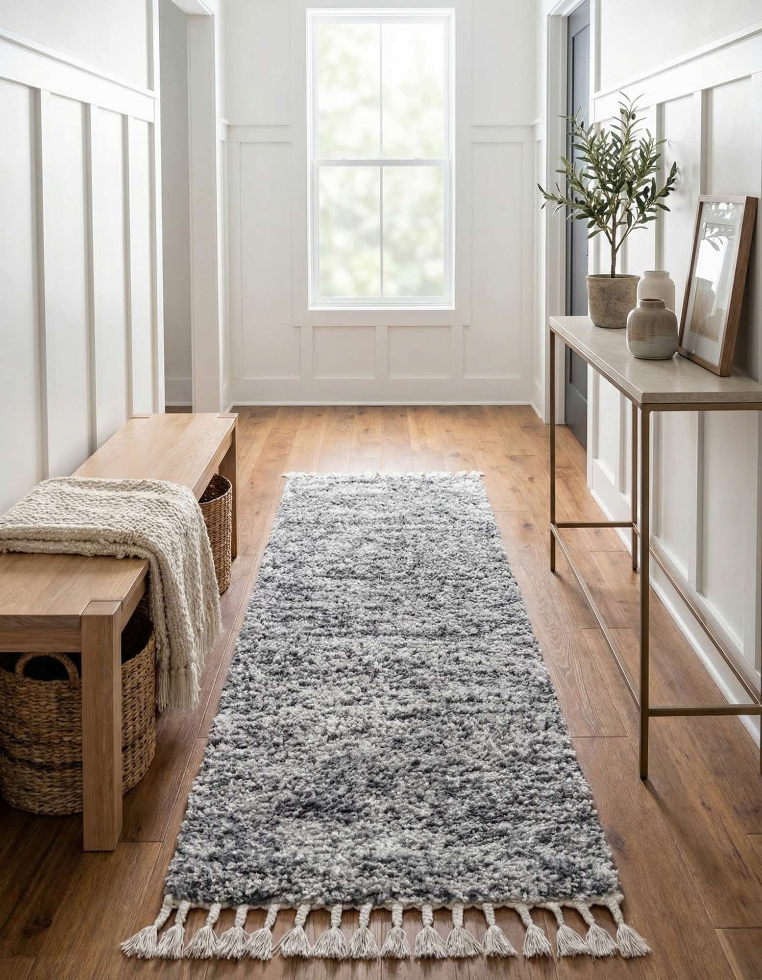 A soft gray Athena Shag runner rug with a thick pile and decorative tassels, perfect for a hallway.