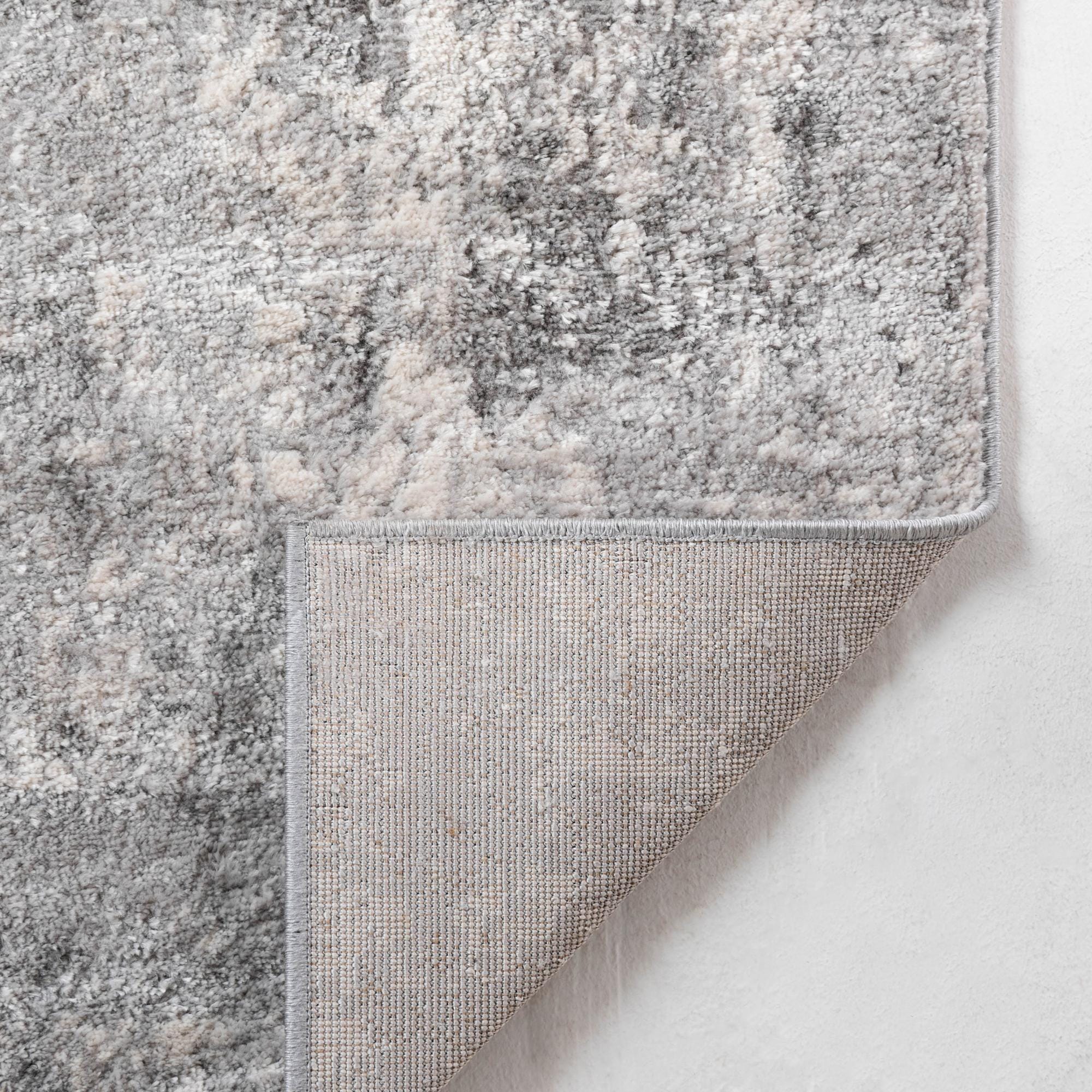A soft gray field provides the backdrop for a subtle, distressed motif in ivory and silver that drifts across the surface in an abstract, low-contrast pattern. The finish is gently variegated rather than sharply defined, giving the rug a lived-in, contemporary look with a light reflective quality from the silver highlights. Machine-made from 60% polypropylene and 40% polyester, the pile feels smooth and softly cushioned underfoot with a gentle sheen that highlights the tonal variations.