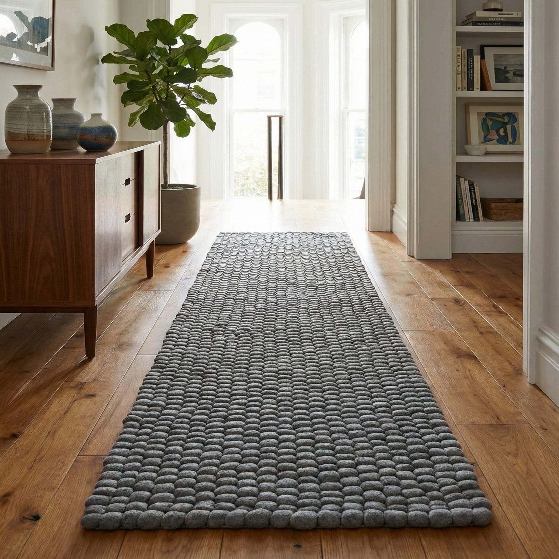 Hand-formed wool felt balls are tightly stitched together into neat, parallel rows to create a long, narrow runner with a bold, tactile surface. The uniform gray color provides a calm, versatile backdrop while the pebble-like texture of the 100% wool construction adds visual depth and a subtle, hand-crafted feel. Running your hand across the pile you notice the low-profile, nubby finish — cushioned underfoot without excess loft — and the clear, linear pattern that follows the length of the piece.