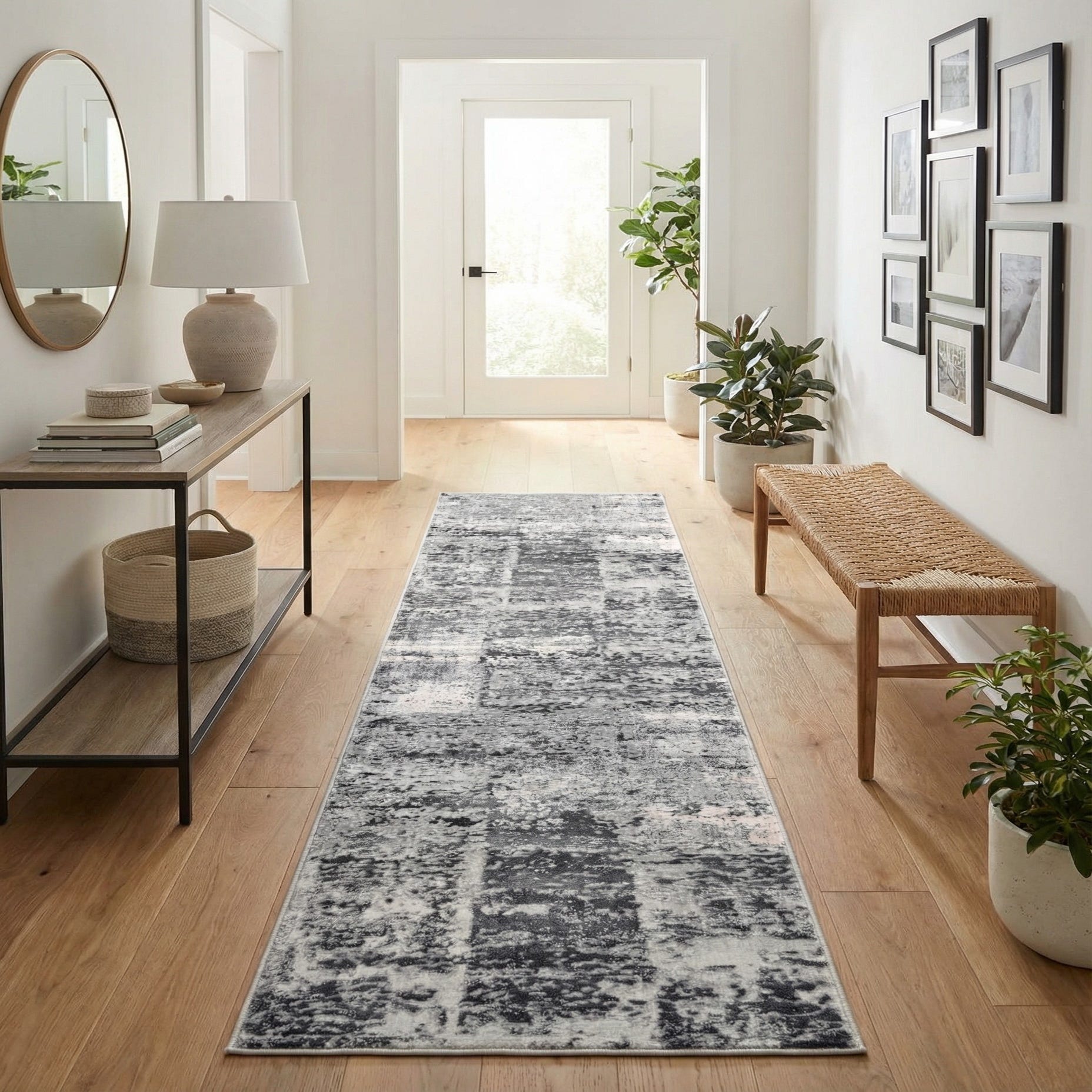 A gray and silver 8 ft runner rug with a modern abstract pattern and textured high-low pile, suitable for a hallway.
