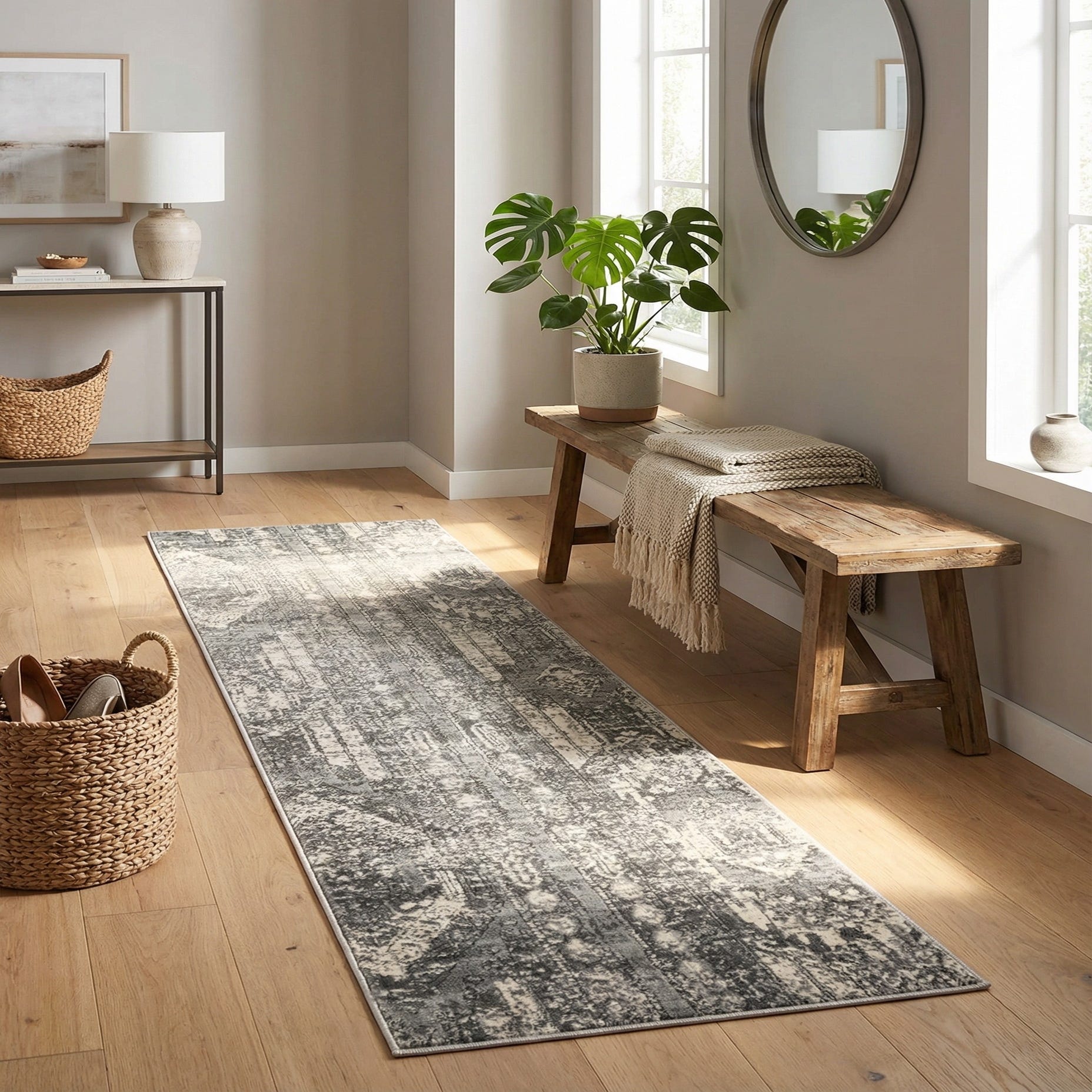 An 8 ft runner rug in shades of gray and silver featuring a textured, distressed bohemian pattern with tribal and stripe elements, ideal for a hallway.