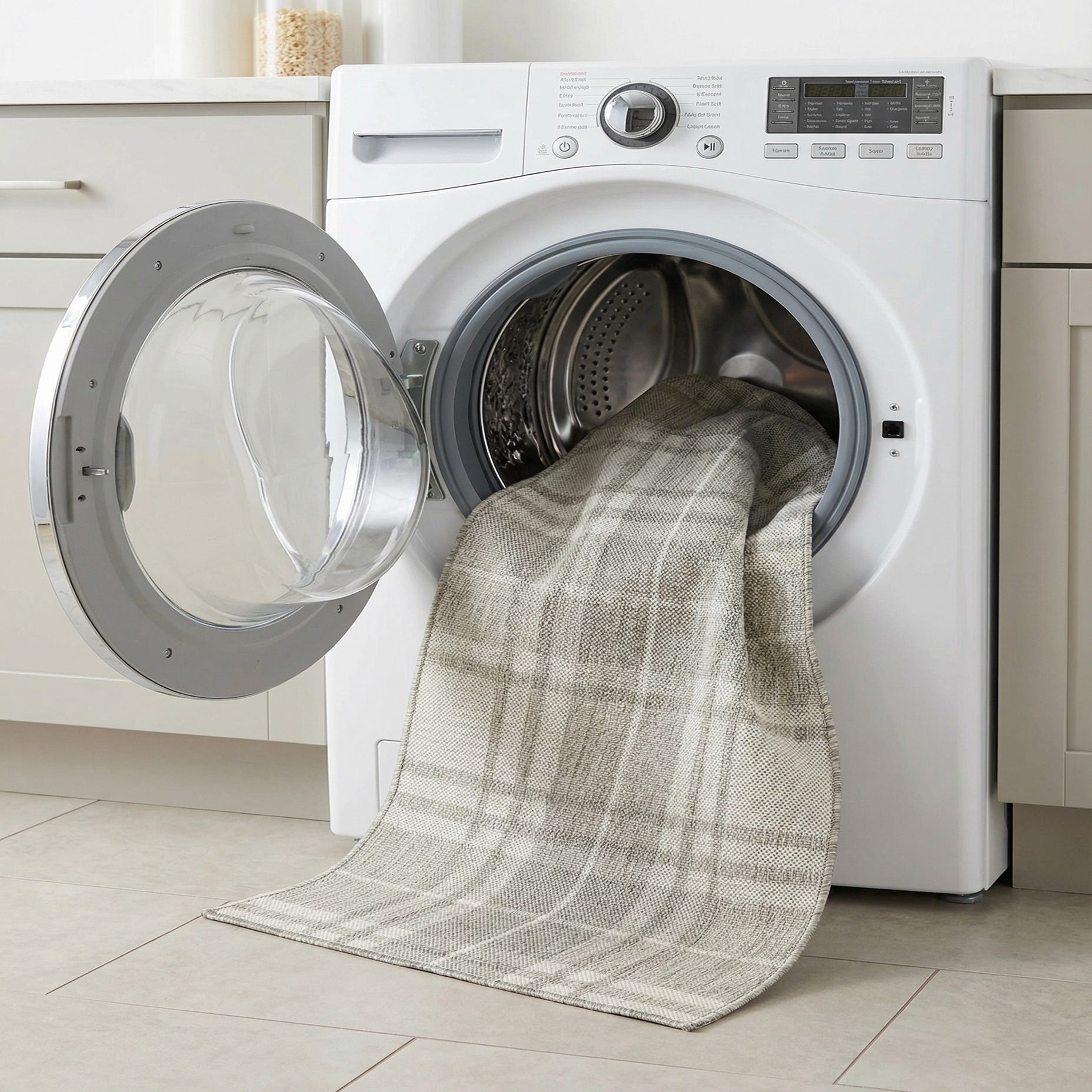 A refined checkered pattern in layered, intersecting bands gives this rug a calm, structured look. The gray background anchors the design while lighter and darker gray stripes create a soft plaid effect with subtle contrast. The surface reads like a flatweave underhand — smooth and firm to the touch with a faintly ribbed texture where the bands overlap, offering visual depth without a high pile.