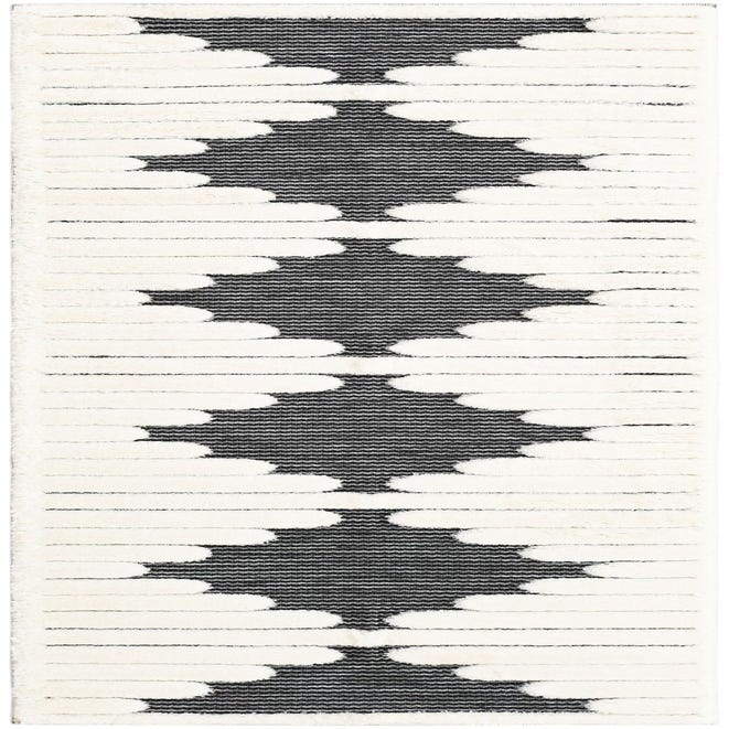 A gray and white runner rug featuring a repeating geometric pattern of large, textured diamond shapes.