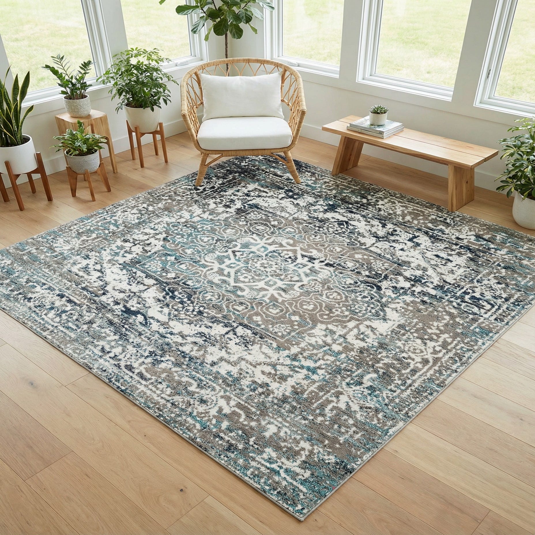 This rug fits well as an anchor for a seating area, placed beneath a sofa and coffee table or layered under a dining set in an open-plan space. It pairs naturally with cool-toned interiors—think light-gray upholstery and navy throw pillows—or with coastal and transitional schemes that use blues and ivories to add depth. It also complements wood floors and neutral tile, bringing pattern and color to entryways, home offices, or bedrooms without overwhelming the room.