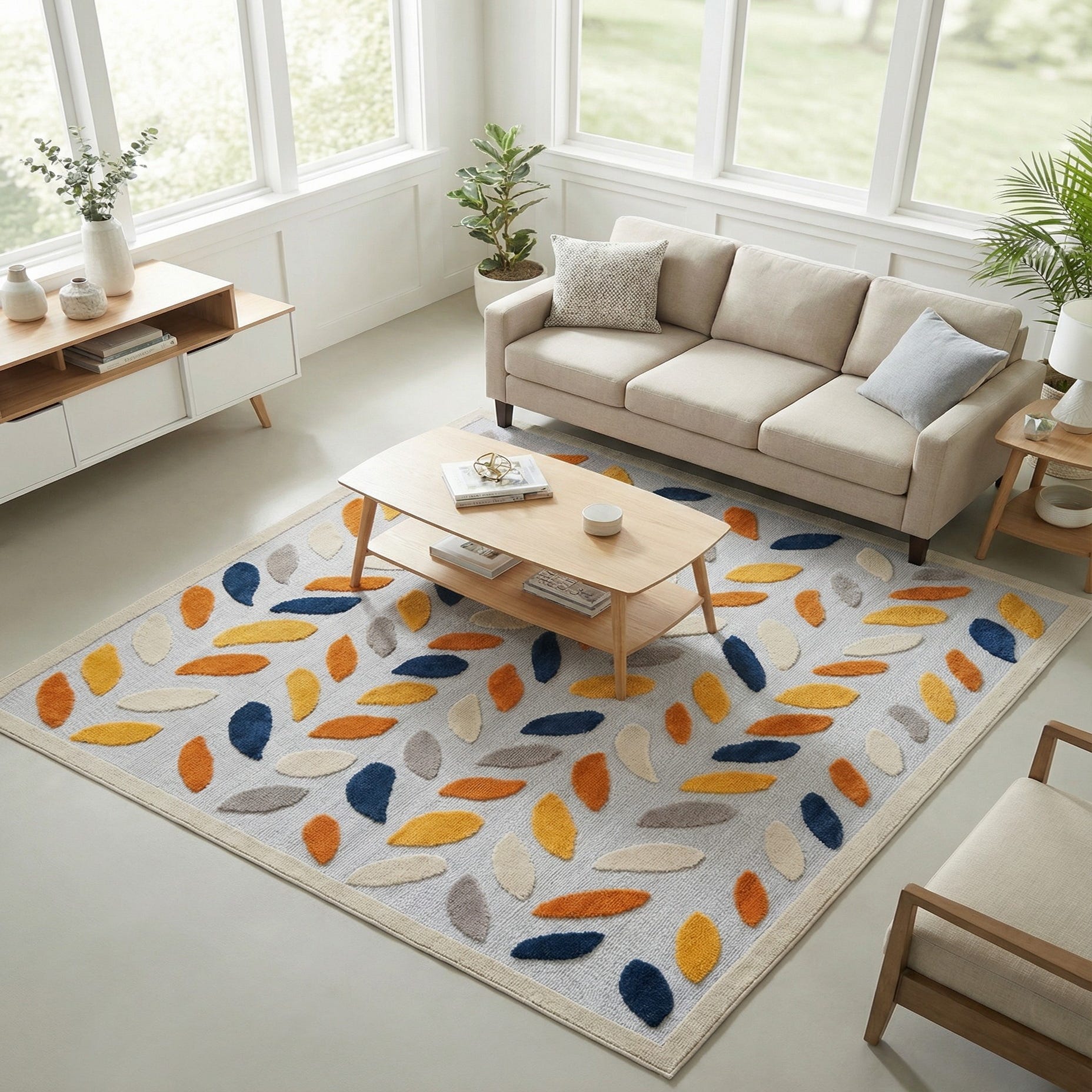 The Aruba Outdoor 8 Ft Square rug presents a playful yet sophisticated pattern composed of organic leaf-like shapes in a dynamic array of colors, including navy blue, yellow, orange, ivory, light brown, and anchored on a versatile gray background. This contemporary design evokes a sense of movement and rhythm, making it a focal point in any space.