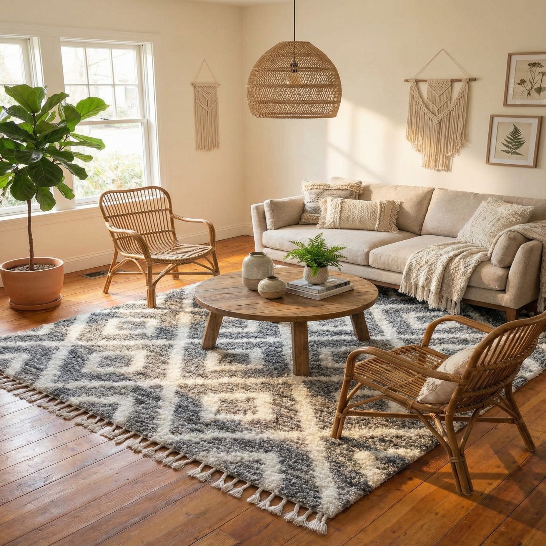 A bold geometric diamond pattern crosses a soft, high-pile shag, creating a contemporary look with a relaxed feel. The gray background anchors the design while ivory lines form the repeating diamond lattice and touches of beige weave through the pile for added warmth and visual depth. Running your hand across the surface reveals a plush, cushioned texture, and short fringe along the ends gives a casual, crafted finishing touch.