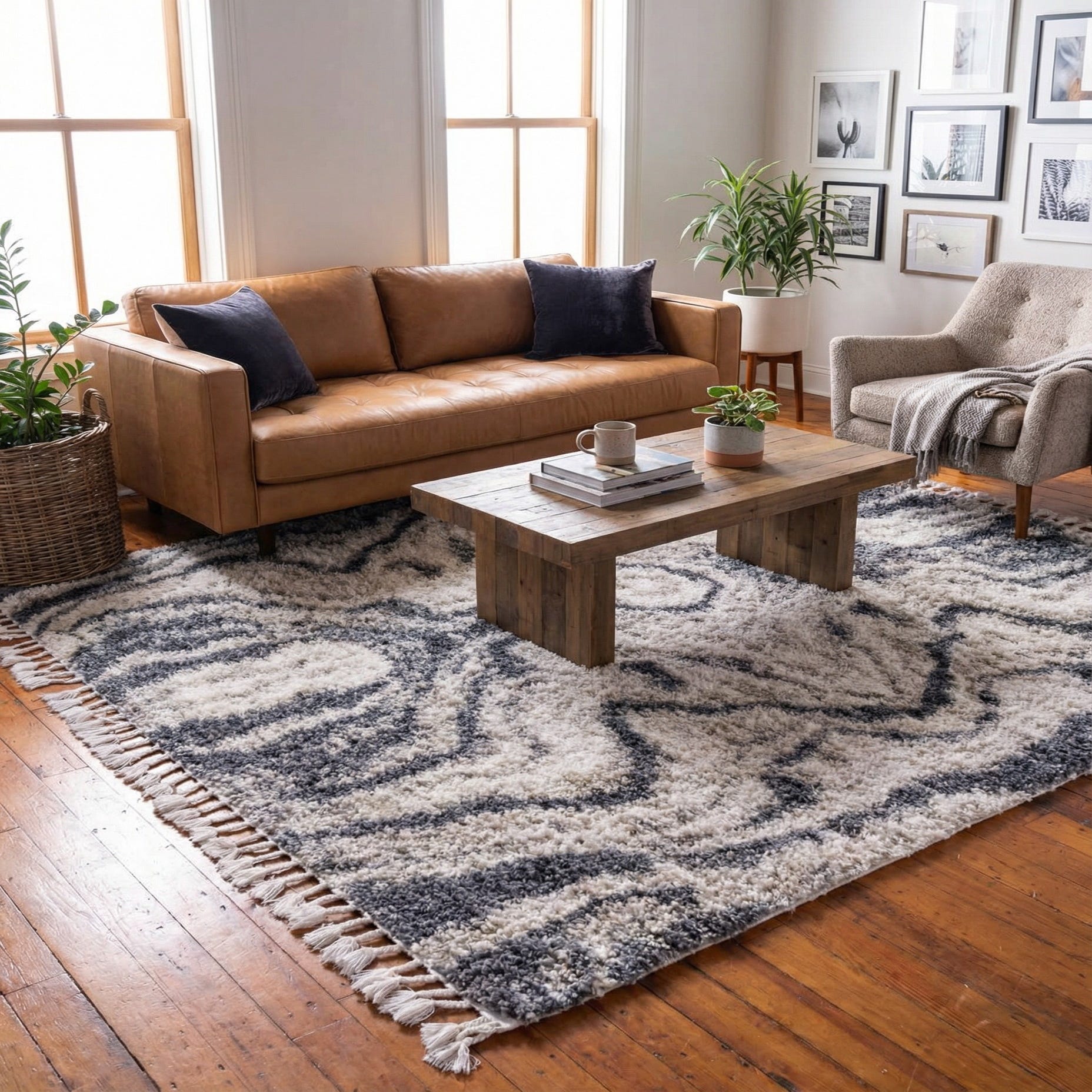 This piece pairs naturally with neutral and cool-toned palettes—think light-gray sofas, warm wood coffee tables, or linen-upholstered occasional chairs. It works well in contemporary and transitional spaces, mid-century modern living rooms, or cozy bedrooms where a soft underfoot layer is desired. Use it to anchor a seating area, soften a reading nook, or add textural contrast beneath a simple dining table for a layered, lived-in look.