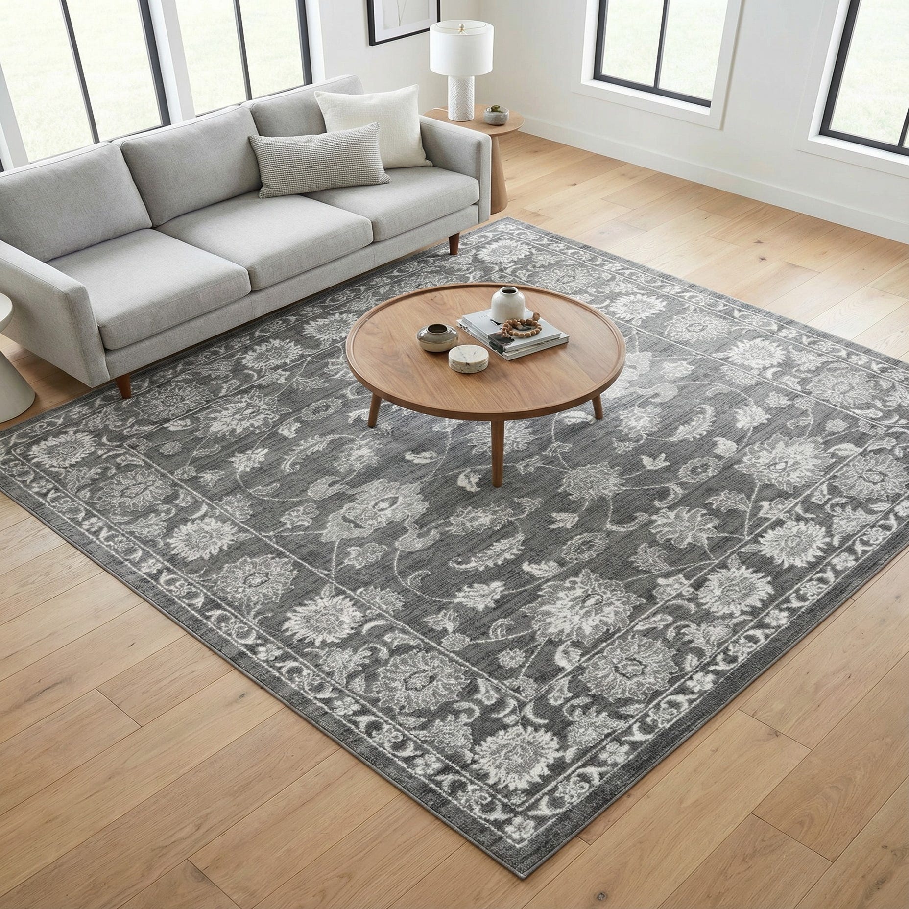 This piece works particularly well in transitional and contemporary interiors where a neutral foundation is needed to anchor furniture. Place it under a seating group to define a living area, center it beneath a dining table to add subtle pattern, or set it in a bedroom to introduce texture without competing with bedding or curtains. The gray background and ivory motif pair nicely with cool metals, warm wood tones, and linen or leather upholstery for layered, cohesive rooms.
