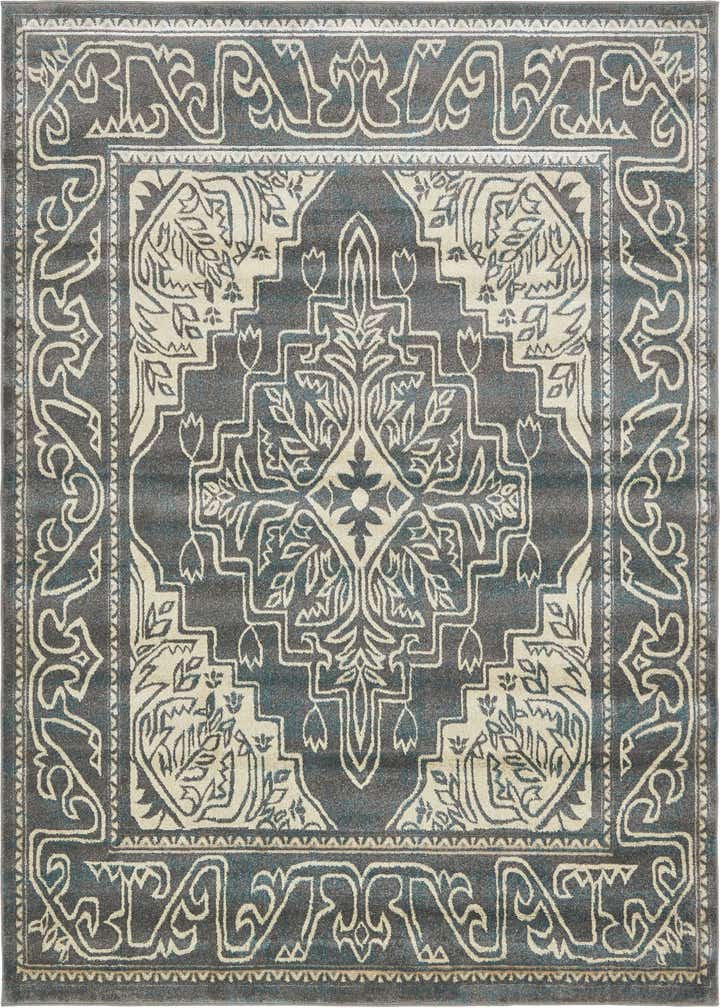 Primary color is Gray. Colors in this rug include: Gray, Blue, Cream.