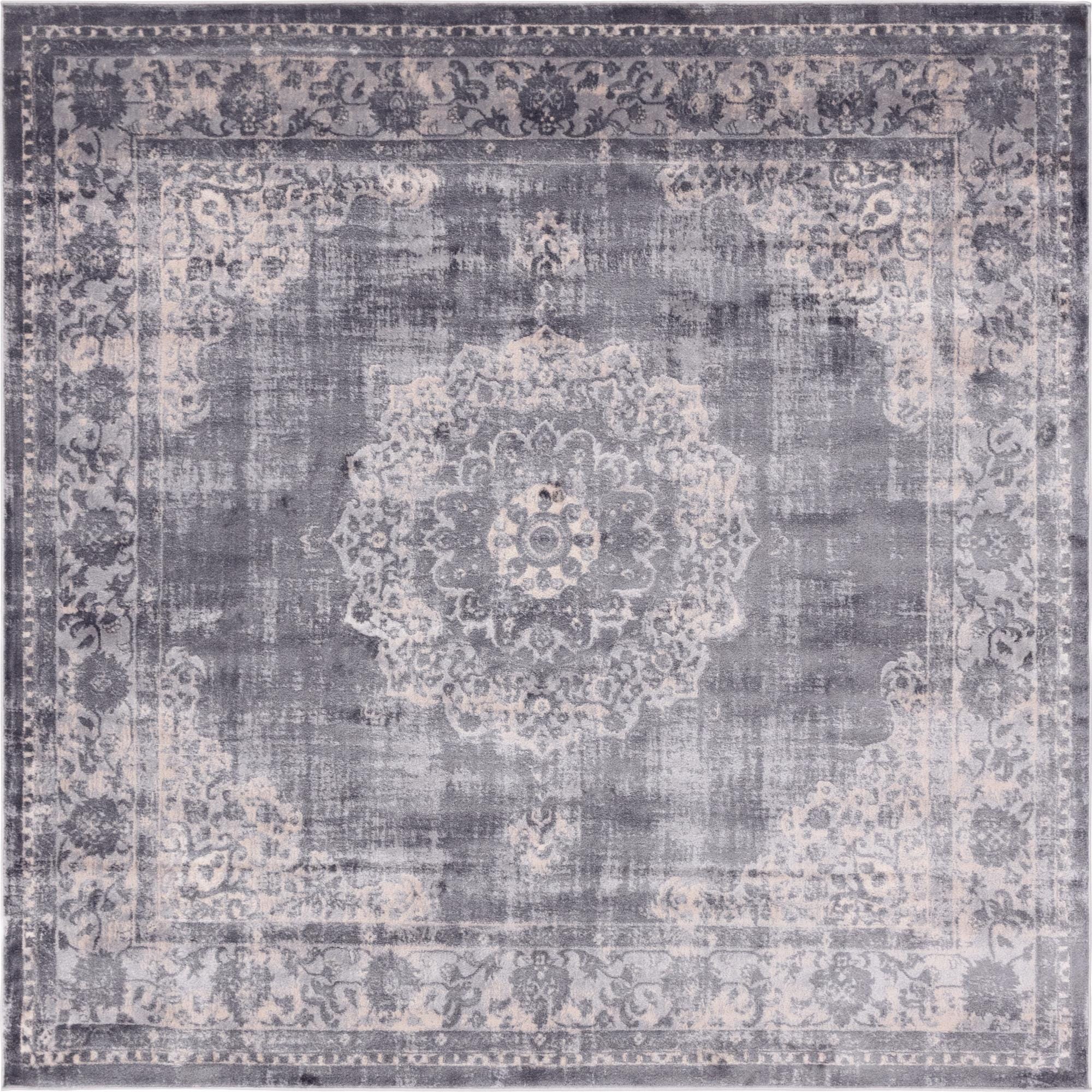 A square 7' 10 x 7' 10 gray area rug with a faded traditional medallion pattern in lighter gray and cream tones.