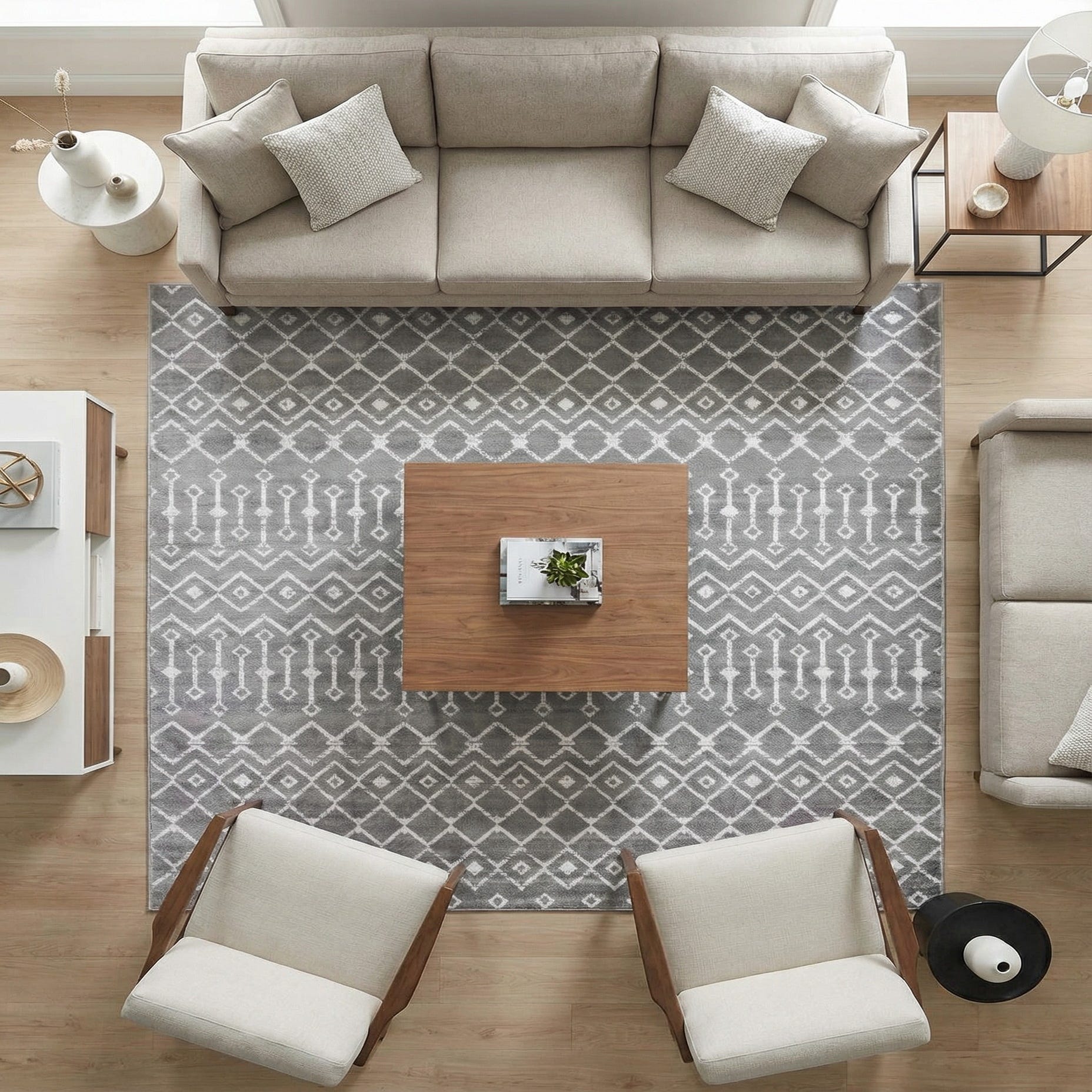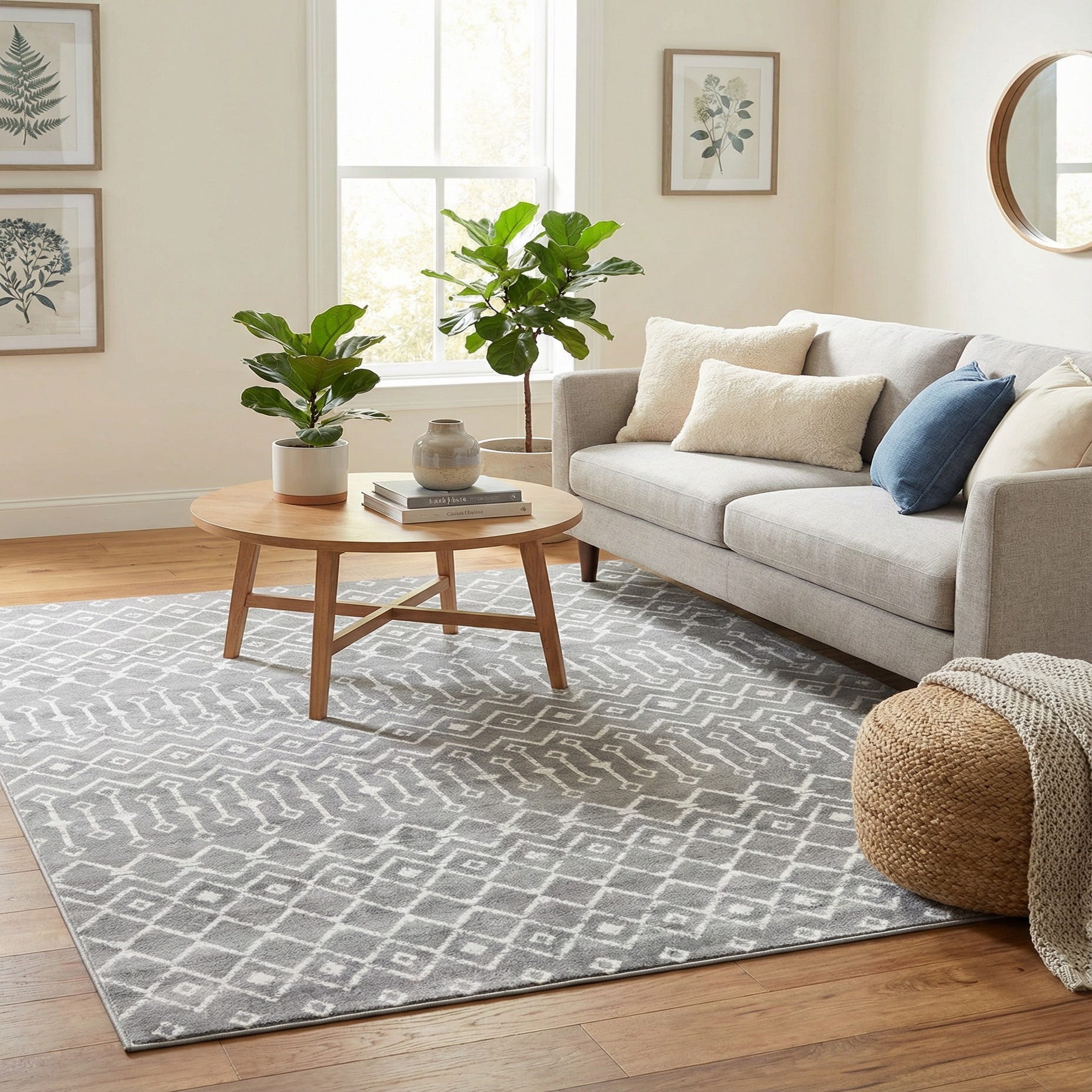 The neutral gray and ivory palette works well in contemporary, transitional, and Scandinavian interiors. Use it to anchor a living room seating area, define a dining space, or add a calm layer at the foot of a bed. Pair with light woods and cool metals for a modern scheme, or add woven textiles and warmer woods for a softer, layered look. Durable polypropylene construction suits everyday rooms where style and reliable performance are both valued.