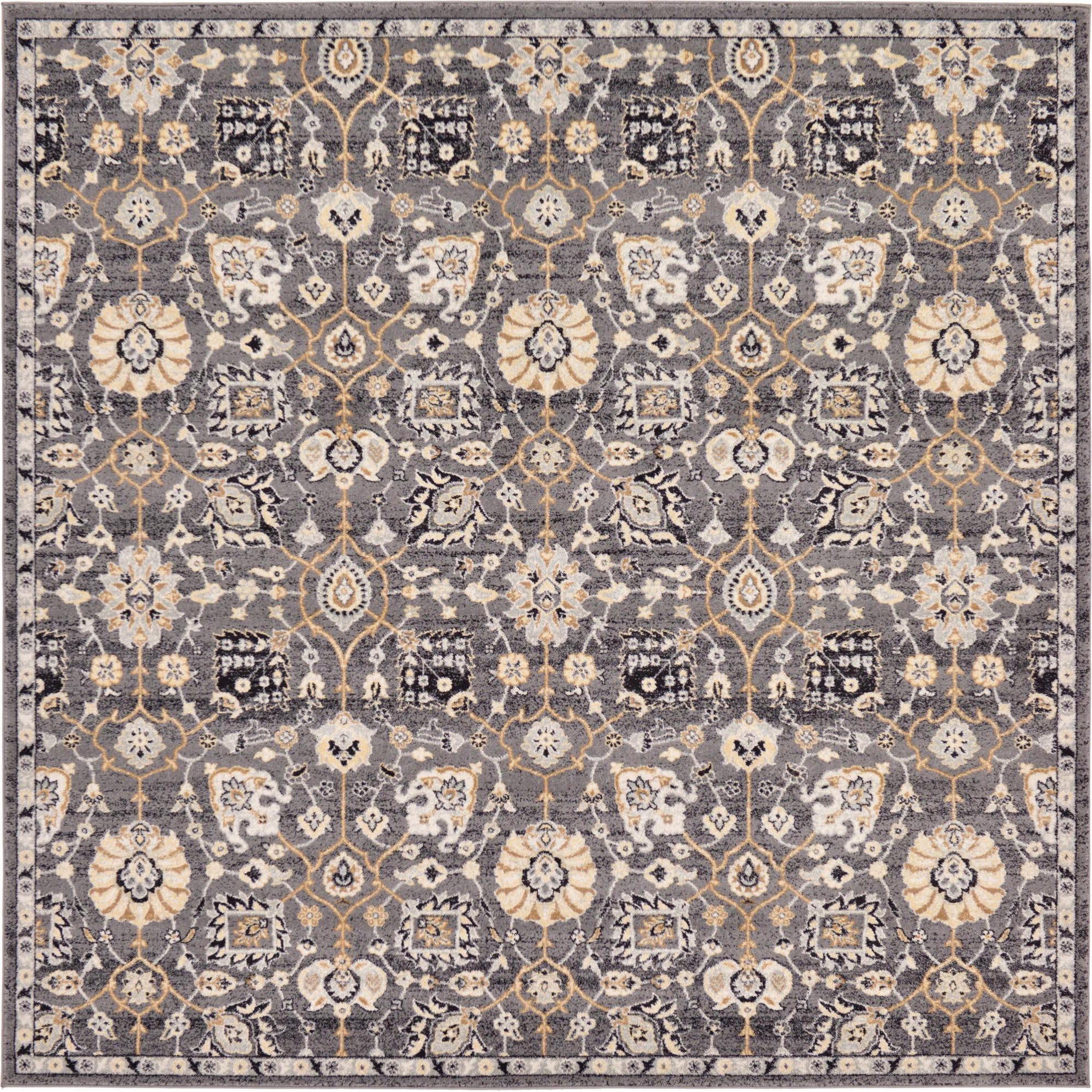 A square 8' 4 x 8' 4 gray area rug with a traditional Bohemian floral and Oriental pattern in cream, gold, and black accents.