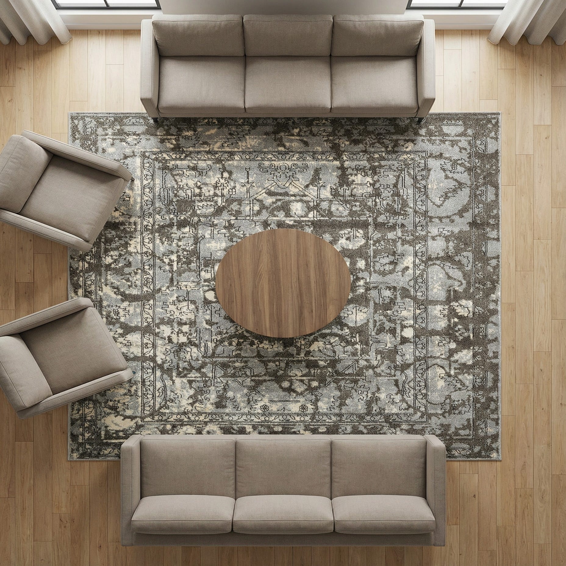 The Miranda Collection presents a machine-woven 8 ft square rug crafted from 100% polypropylene. This durable piece showcases a sophisticated gray background, complemented by silver and ivory accents. The nuanced palette creates an elegant foundation for a variety of home settings.
