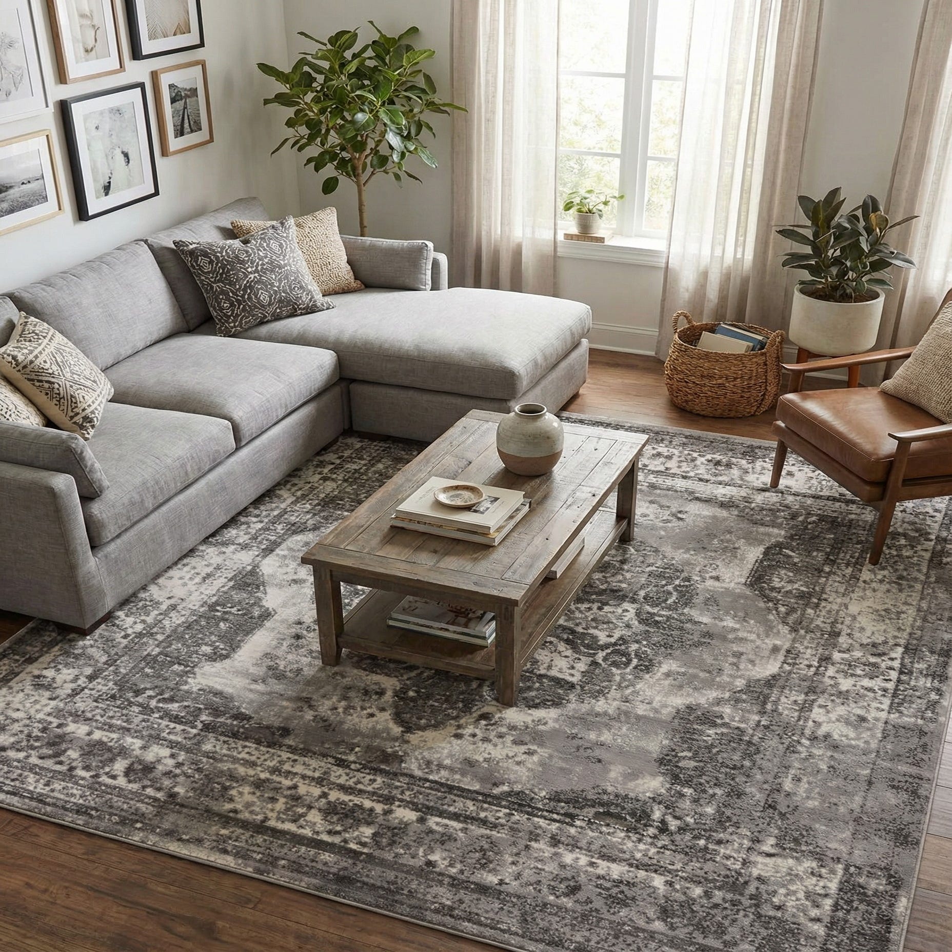 A softened, vintage-inspired medallion rests at the center of this rug, framed by a series of worn borders that create a layered, timeworn look. The background is a cool gray with beige highlights threaded through the pattern, producing a muted contrast that reads calm and collected. The distressed surface and subtle shading create visual depth while keeping the overall effect understated and adaptable.