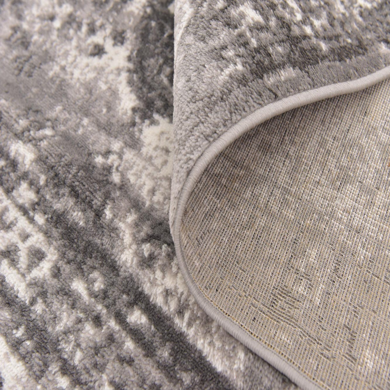 A softened, vintage-inspired medallion rests at the center of this rug, framed by a series of worn borders that create a layered, timeworn look. The background is a cool gray with beige highlights threaded through the pattern, producing a muted contrast that reads calm and collected. The distressed surface and subtle shading create visual depth while keeping the overall effect understated and adaptable.