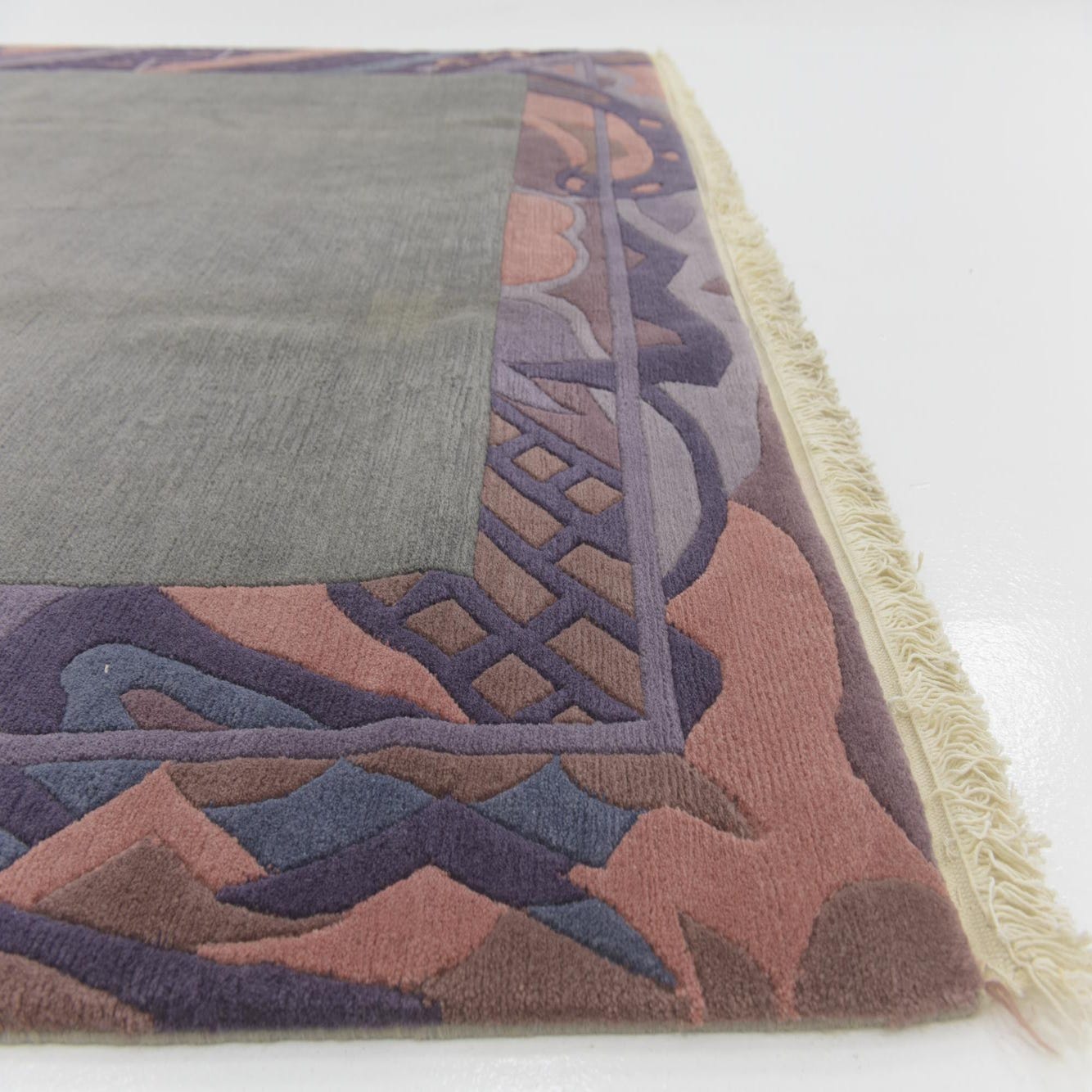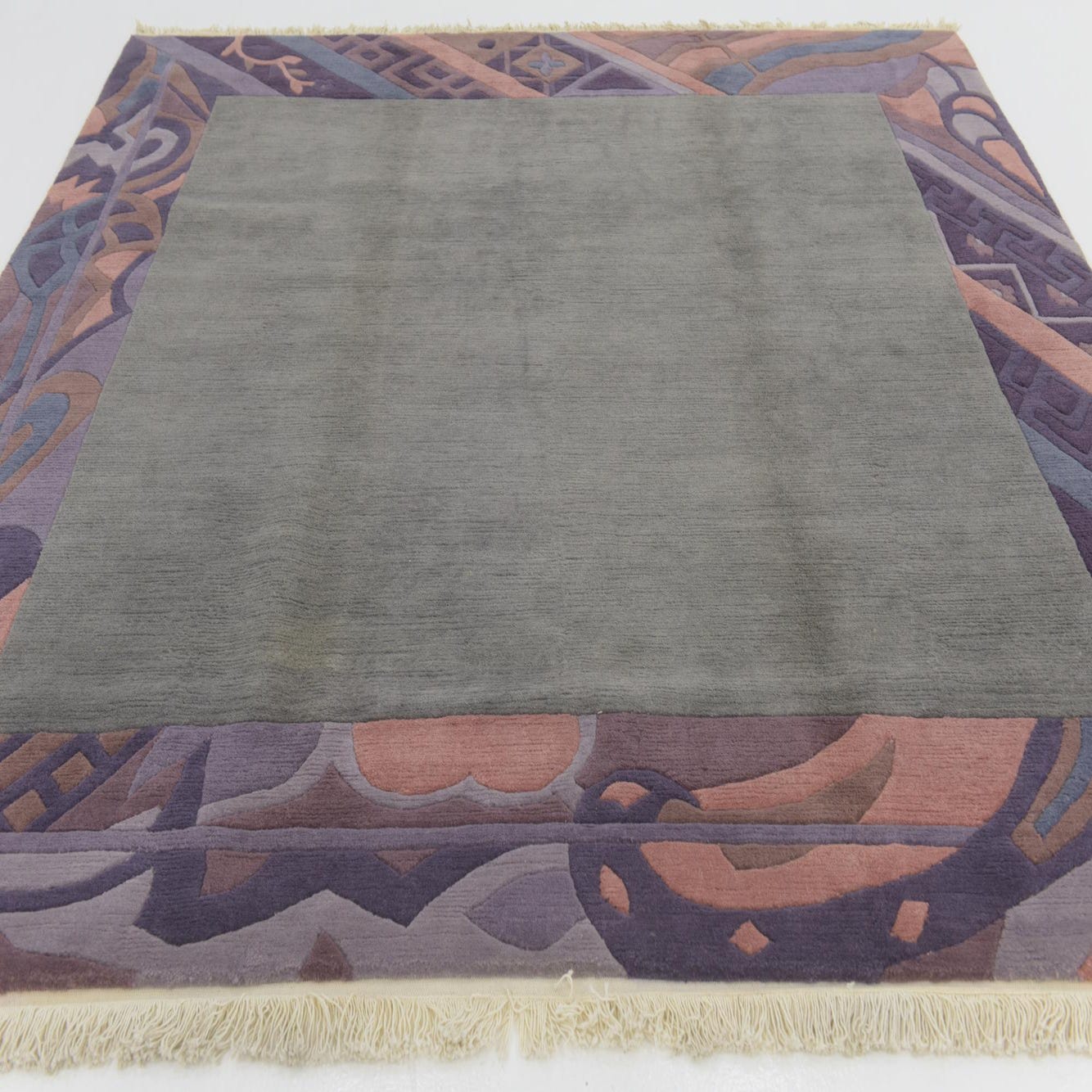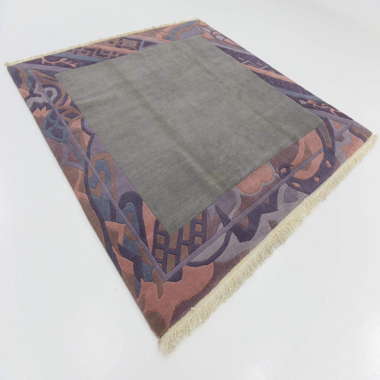 A square 8' 2 x 8' 4 gray wool rug with a wide, multi-colored abstract and oriental border, featuring shades of purple, blue, brown, and peach, with fringe.