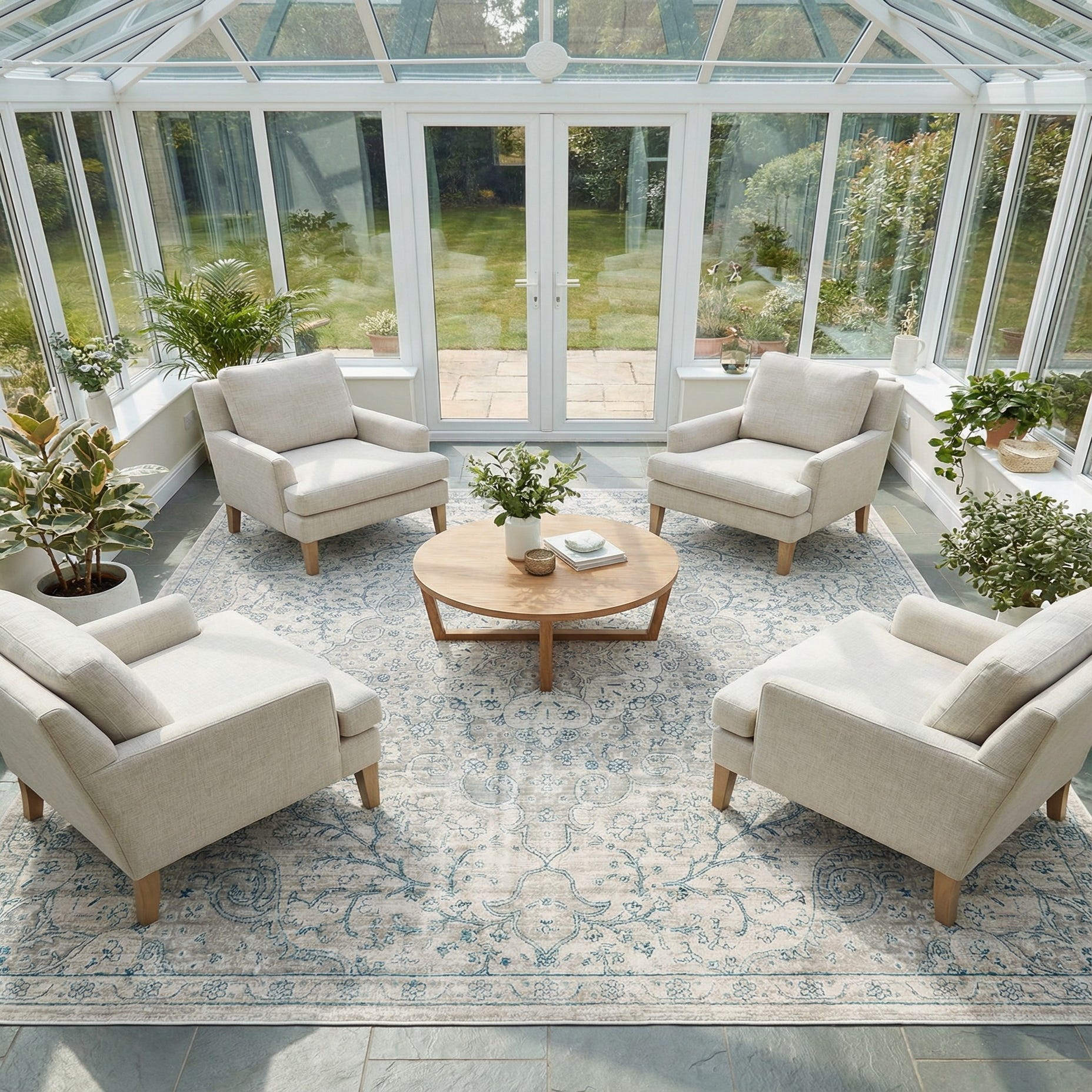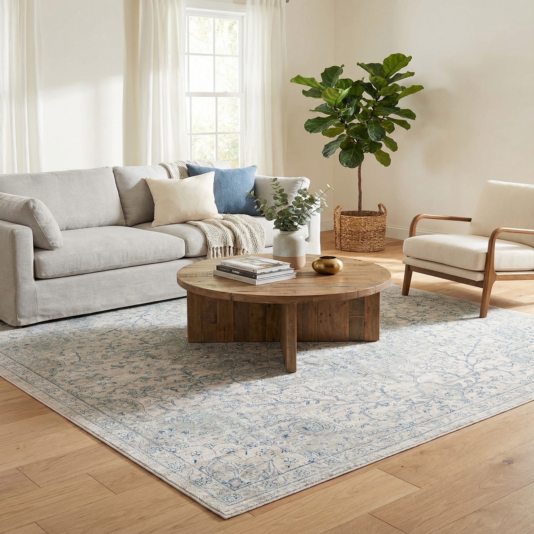 This rug works well in a living room anchored by neutral upholstery and natural wood tones, or beneath a dining table in a light, coastal-inspired scheme with navy or blue accents. It also fits a transitional bedroom or home office where a subtle, classic pattern is desired without overwhelming the space.