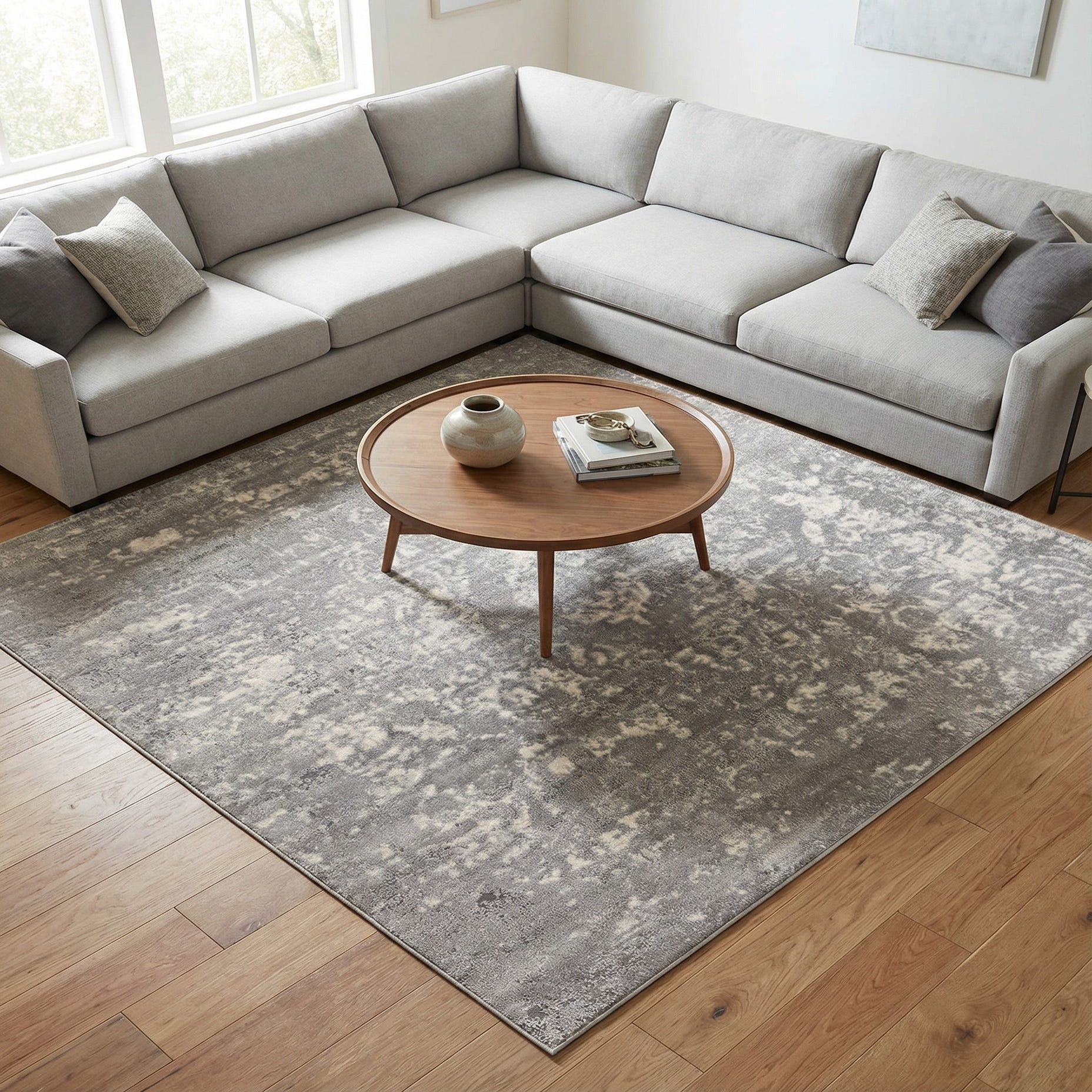 A muted, distressed medallion pattern washes across a gray background with soft ivory highlights, giving the rug a gently worn, vintage-inspired look. Machine made from 85% polypropylene and 15% polyester, the surface has a low-pile, slightly velvety feel that responds to light with a subtle sheen from the polyester fibers. The pattern balances organic, painterly texture and classical motifs, so the overall effect is layered without feeling busy.