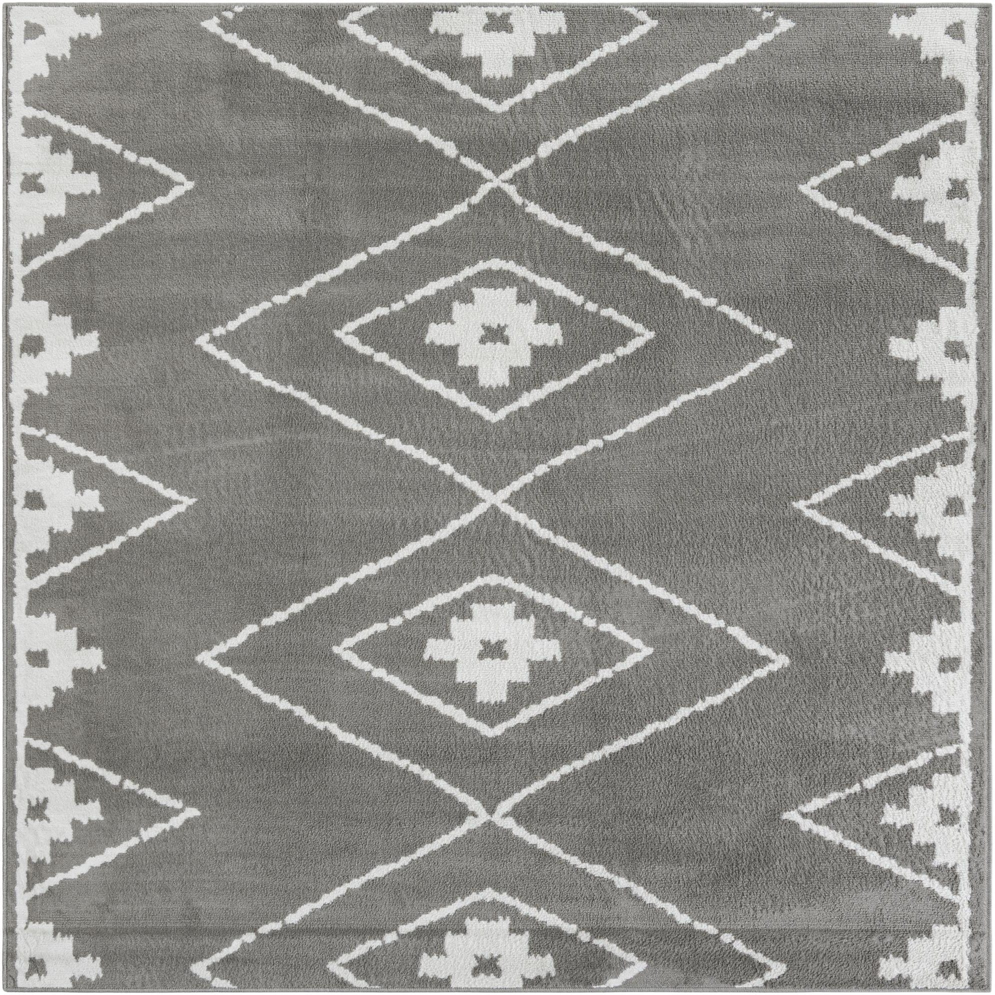 A square 7' 10 x 7' 10 gray modern area rug with a white geometric diamond pattern, suitable for indoor use.