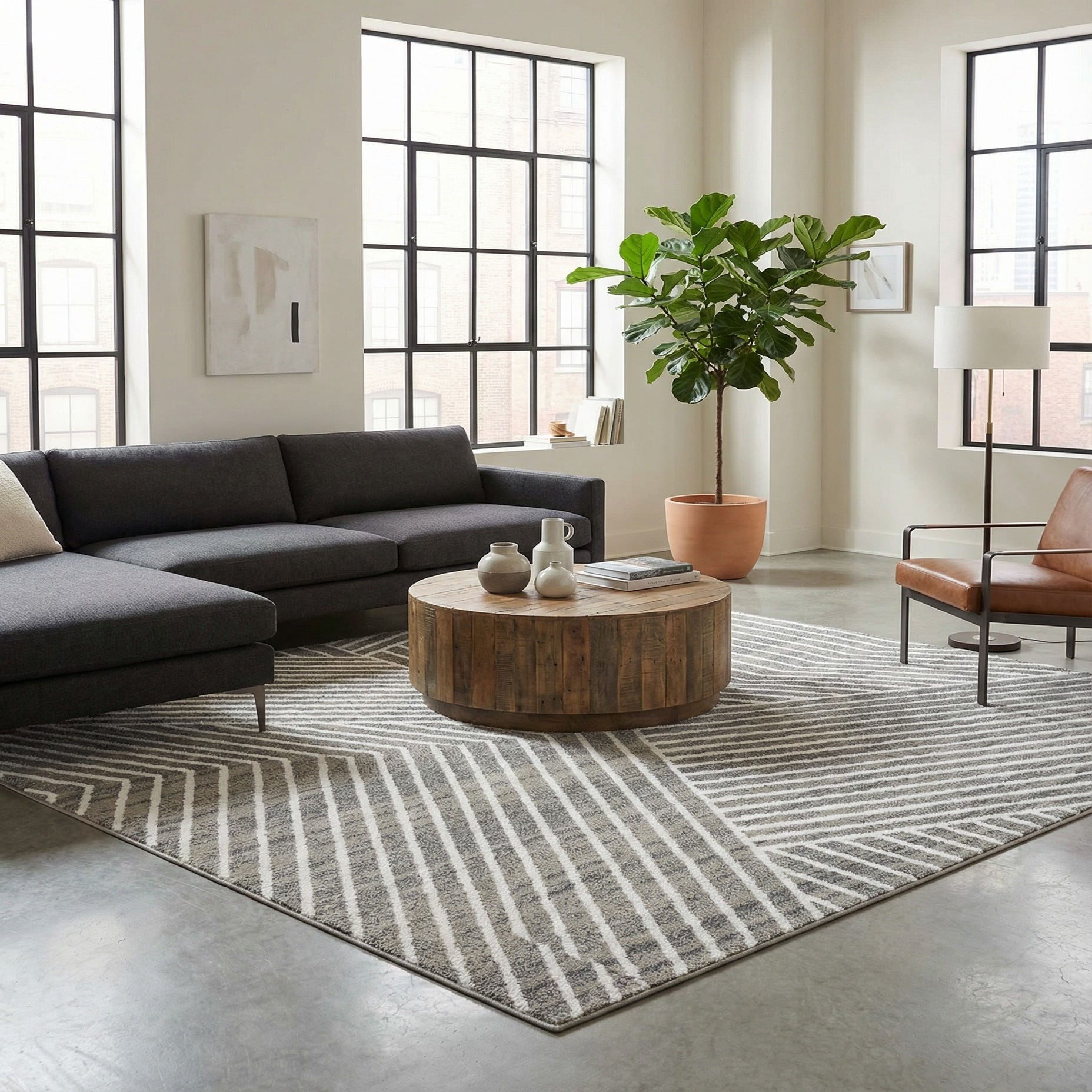 The surface has a subtle tactile contrast where the ivory stripes lift slightly above the denser gray field, offering a pleasant underfoot feel. Machine-made from 100% polypropylene, the construction delivers consistent texture and color. This rug pairs well with Scandinavian or mid-century modern interiors, anchoring a seating area beneath a coffee table or defining a home office. It also complements light wood tones and linen upholstery, or provides a neutral counterpoint to leather and metal accents in an urban living space.