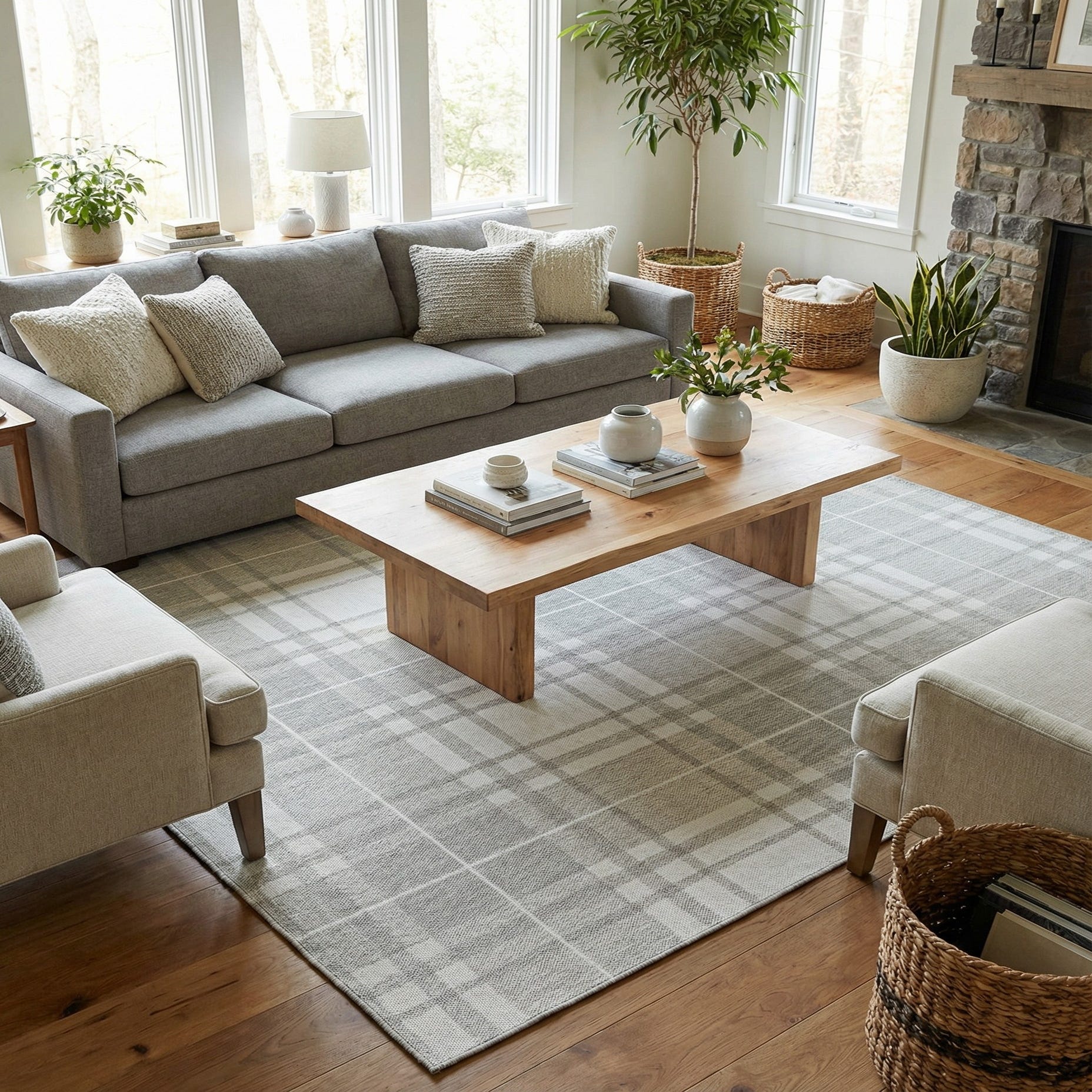 Given its neutral palette and durable design, this rug can seamlessly integrate with a variety of decor styles. It serves as a versatile backdrop for contemporary outdoor patios, sunny garden rooms, or even as an understated yet elegant element in a minimalistic living area. The checkered pattern pairs well with both bold and subdued color schemes, providing a harmonious balance for outdoor furniture and accessories.