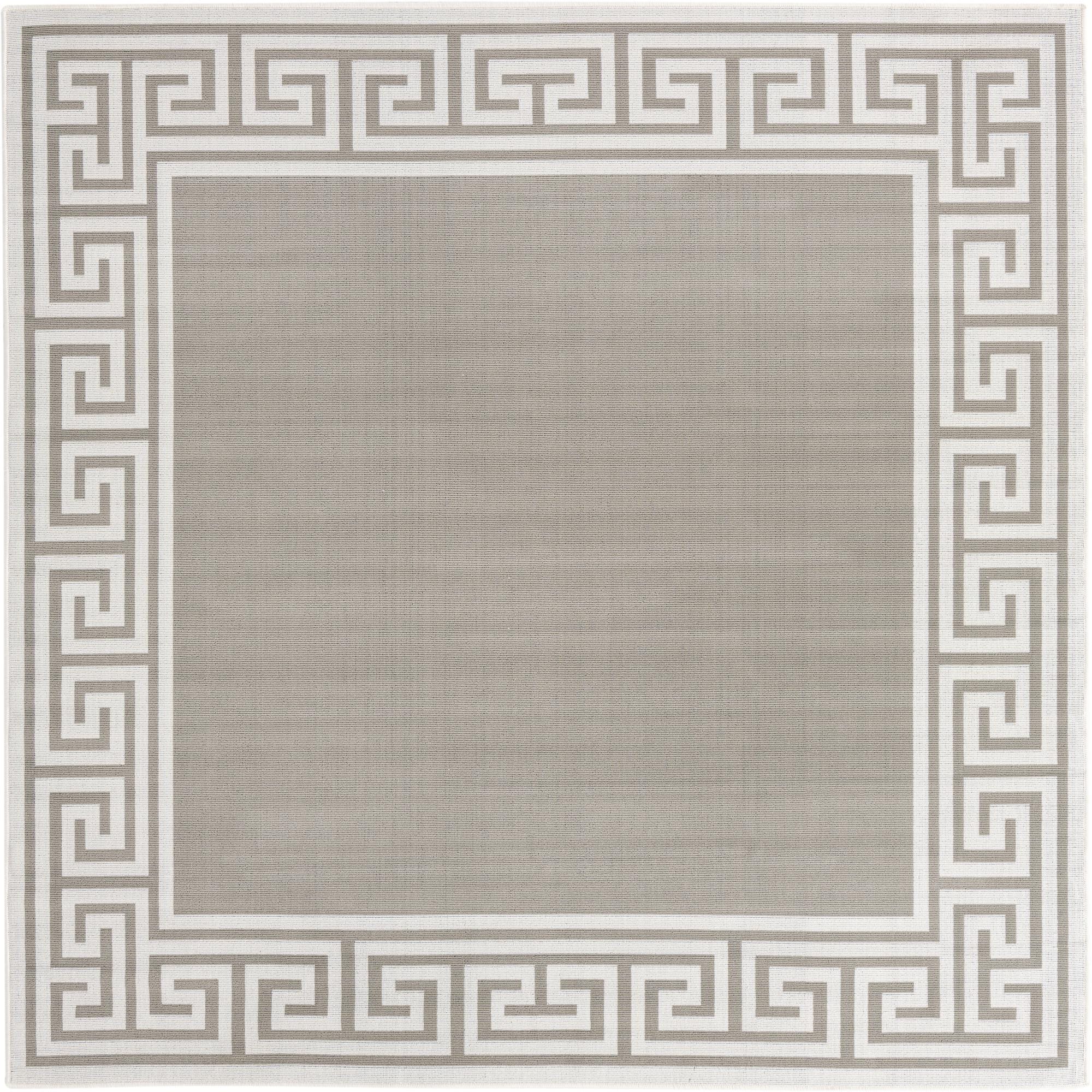 This Outdoor Coastal collection rug, measuring 8 feet square, presents a clean and contemporary addition to any outdoor space. The rug features a smart, geometric border pattern in ivory that elegantly frames the solid gray center, providing visual interest without overwhelming the design space. The color palette is a versatile combination of gray and ivory, grounding the space with a neutral tone that allows for flexible styling with various decor elements.
