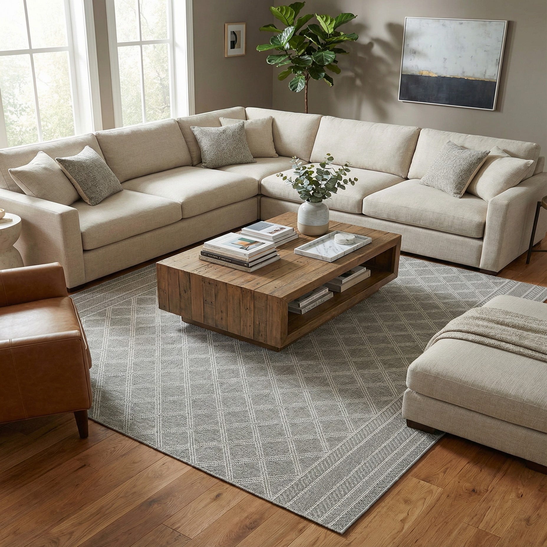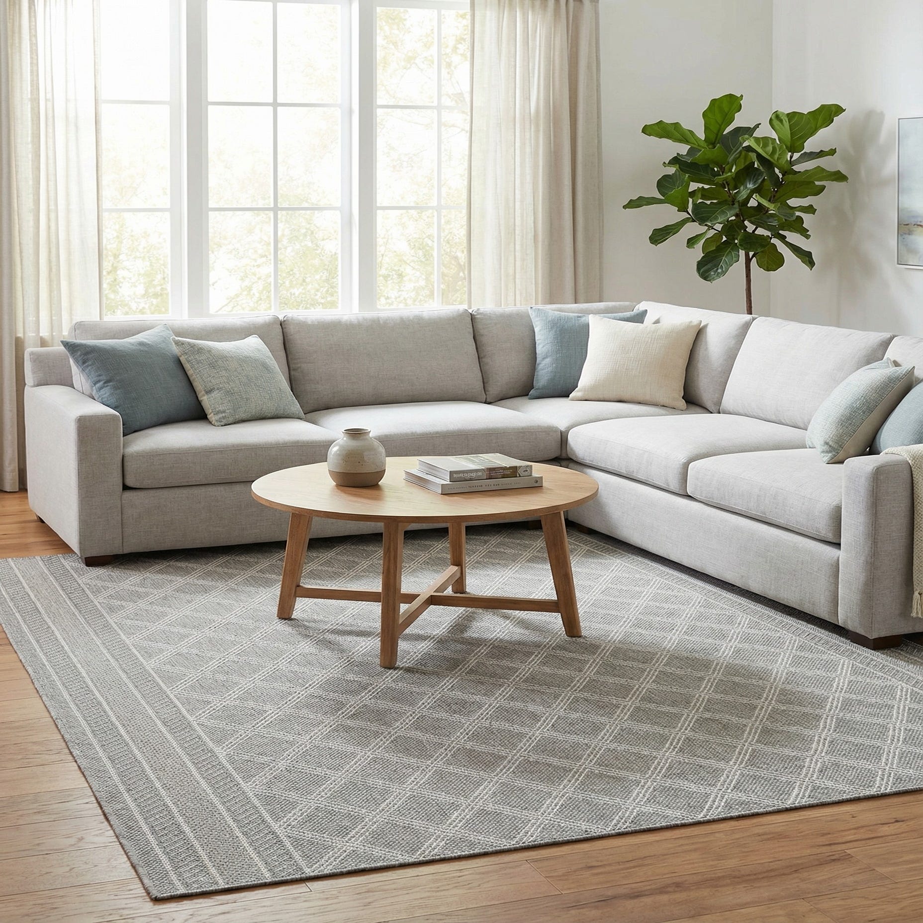 The elegant yet subtle pattern of this rug makes it a perfect addition to various decor styles, from contemporary outdoor living areas to casual indoor spaces that call for a touch of understated sophistication. Whether you are looking to complement a minimalist patio setup, enhance a sunroom with textural contrast, or anchor a dining area with a practical yet stylish flooring solution, this rug can adapt to a variety of interior design scenarios.