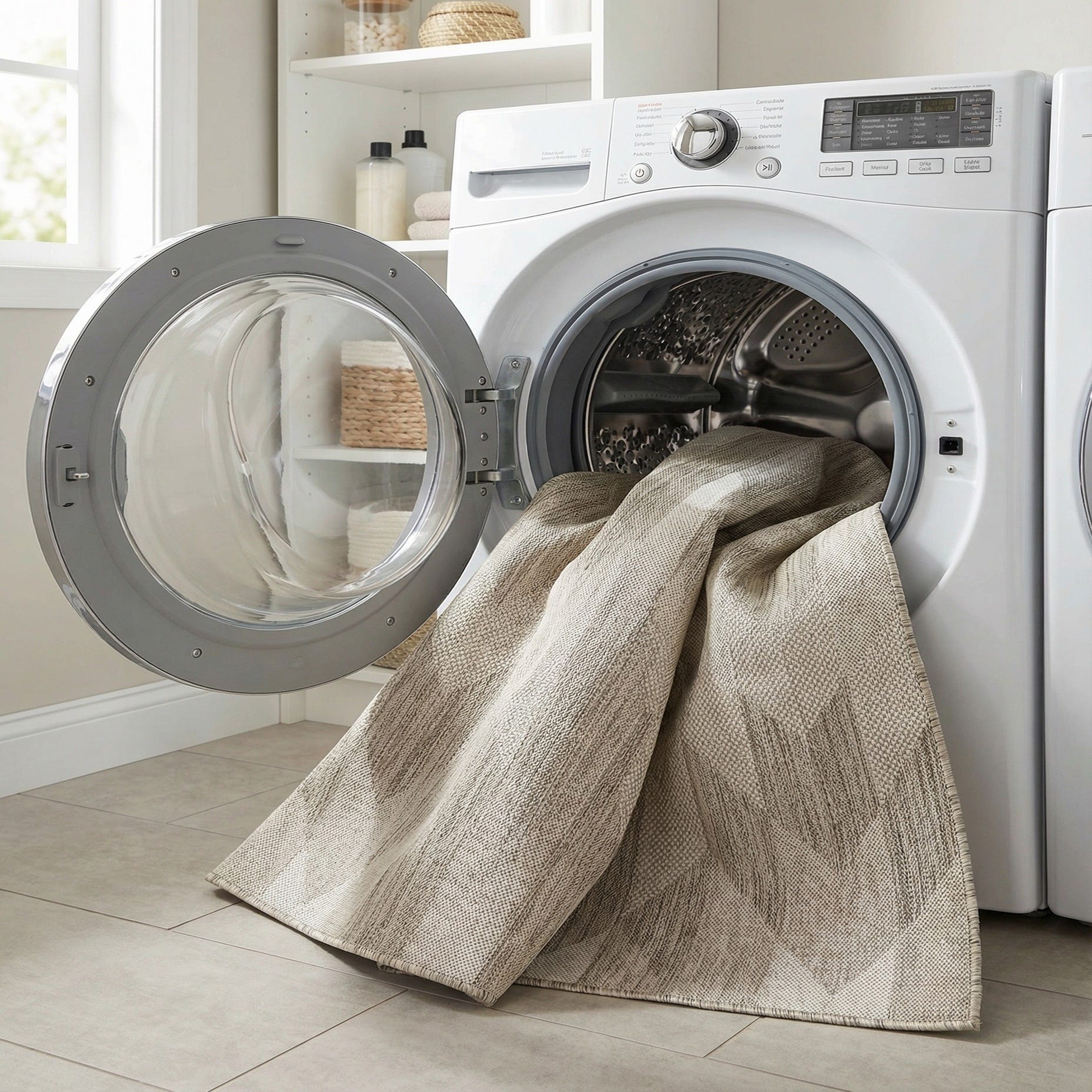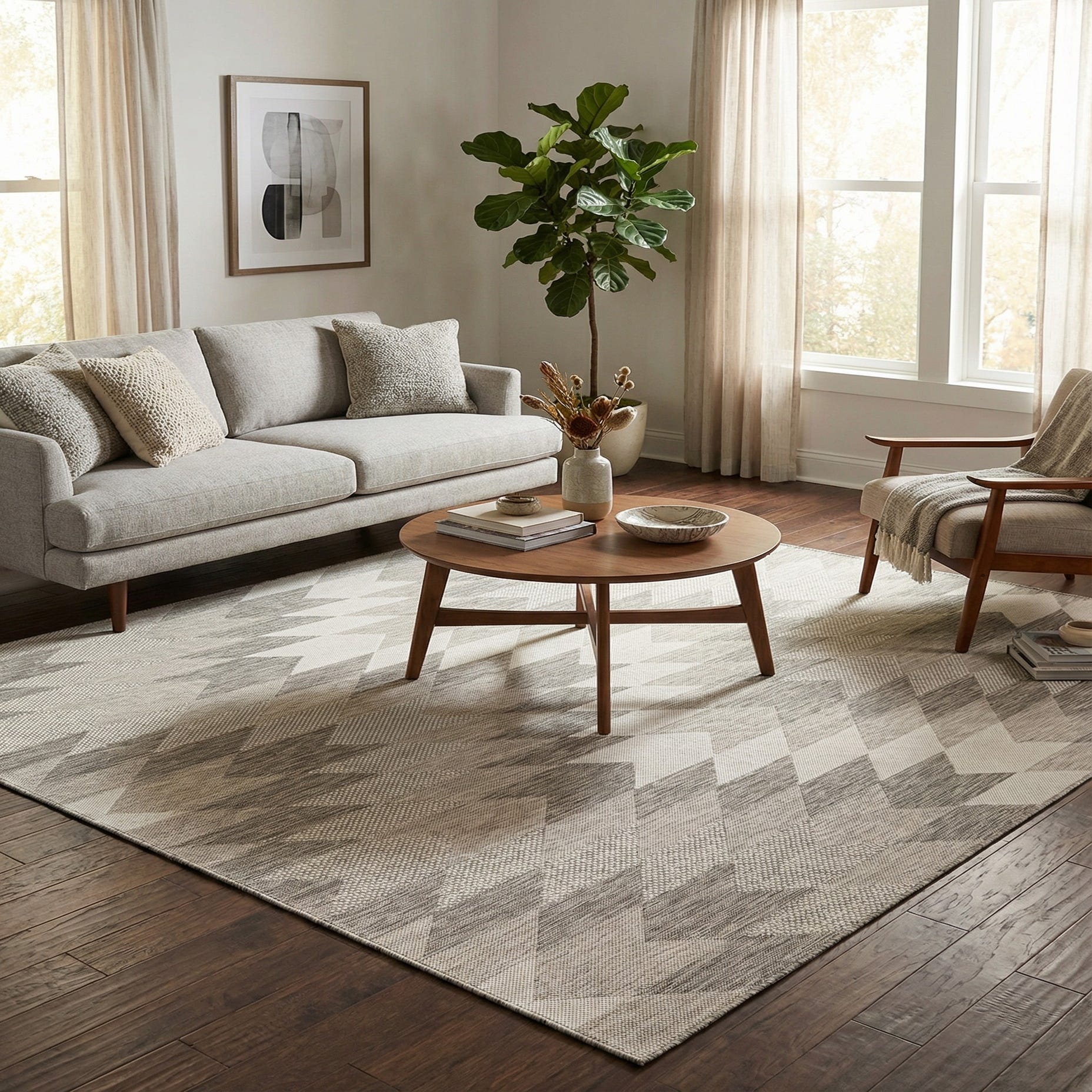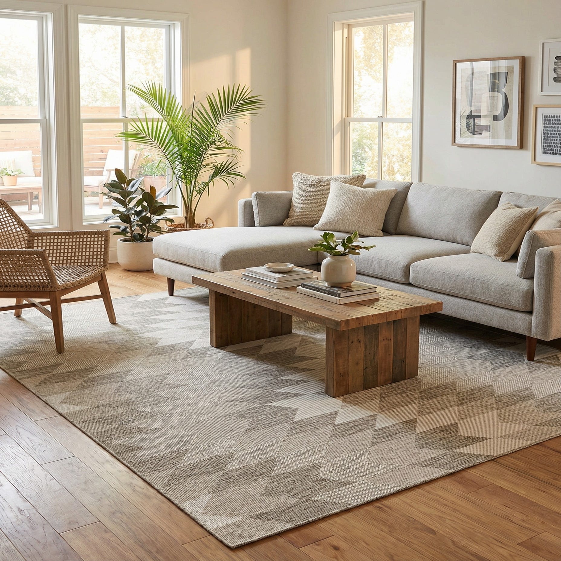 This neutral palette and modern geometric layout work well on a covered patio or sunroom, under a dining table, or layered in a contemporary living room to ground clean-lined furniture. Pair it with metal-frame seating and woven outdoor cushions for a relaxed, modern outdoor setup, or place it beneath a light-wood dining set and ivory textiles for a breezy, transitional indoor look.