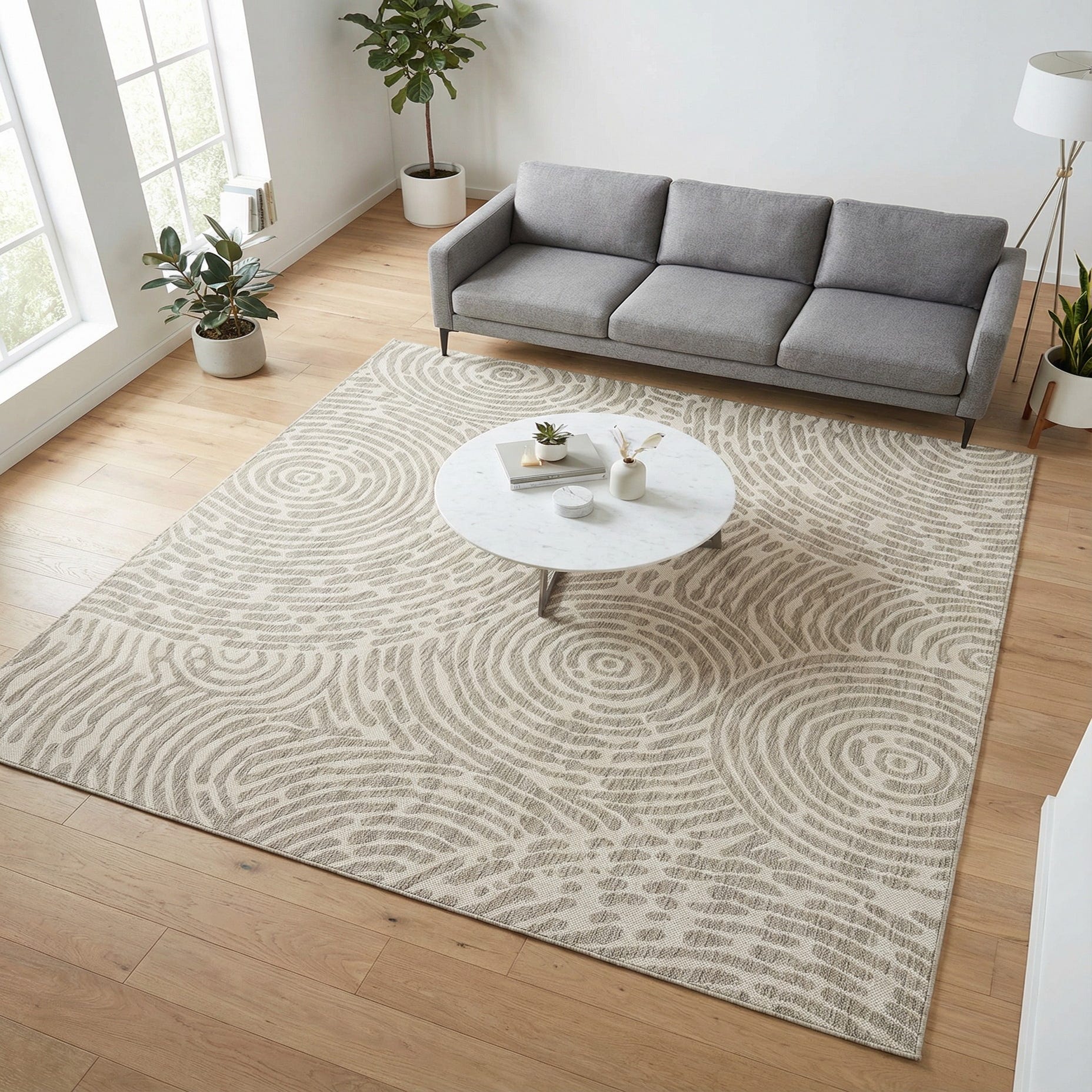 A swirling, concentric-ring pattern in ivory crosses a warm gray ground, lending the rug a modern, nature-inspired rhythm. The design alternates tighter and looser bands to create subtle movement without overwhelming the space. Machine-made from 100% polypropylene, the construction delivers a low, tightly woven surface that feels smooth underfoot with a slight textured contrast where the ivory motif meets the gray background.