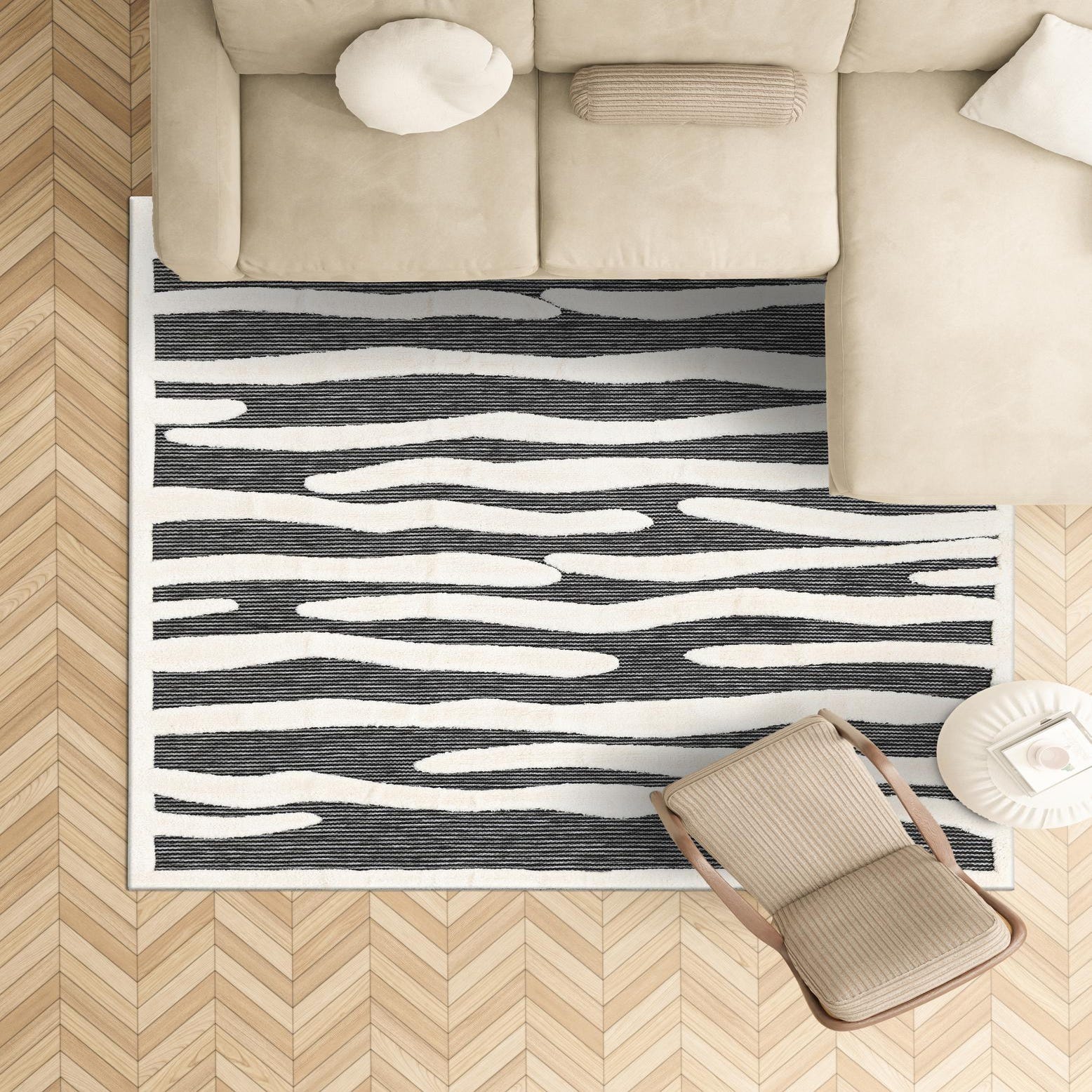 A square 7' 10 x 7' 10 gray and white area rug featuring a modern abstract wavy stripe pattern, ideal for a contemporary living space.