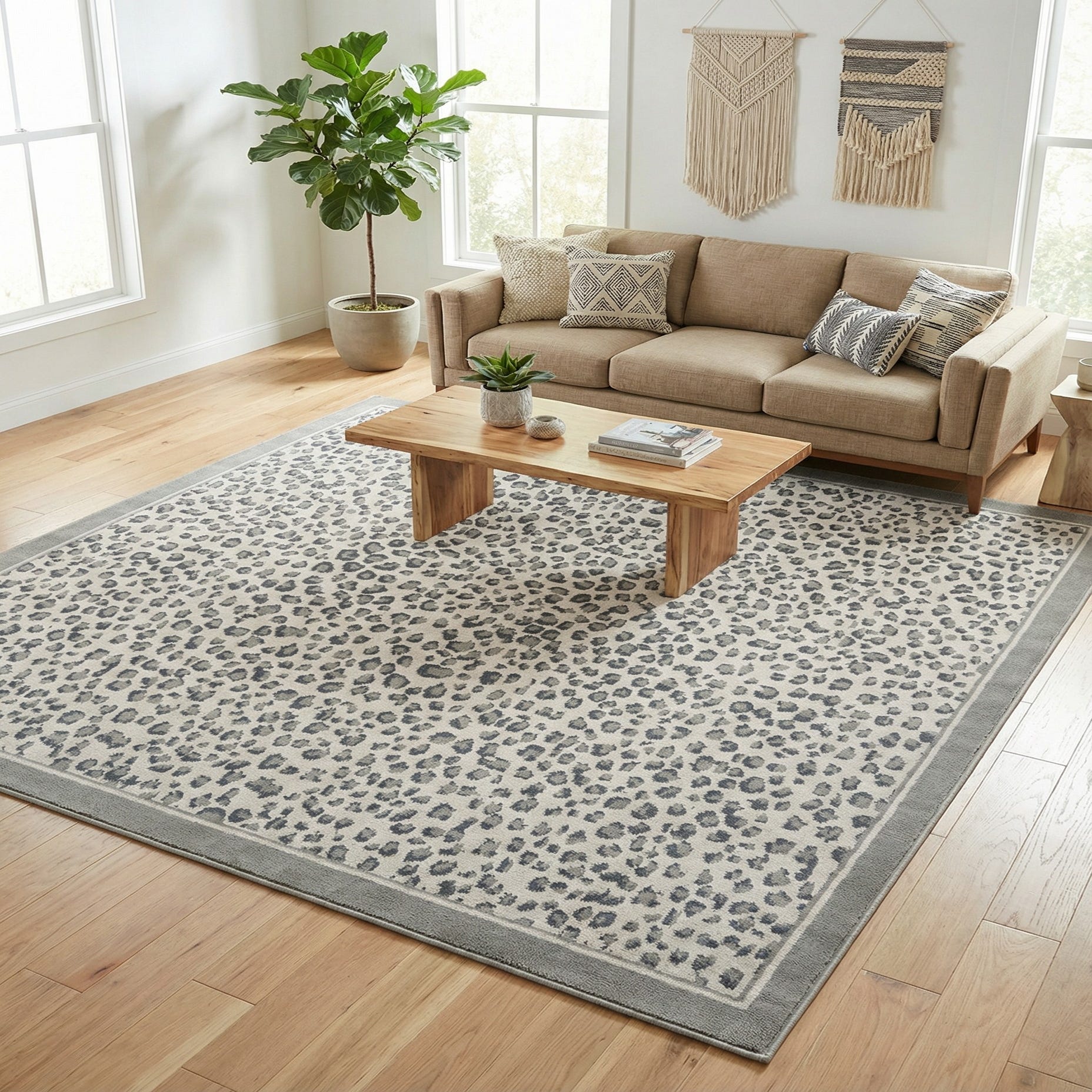 A subtle animal-print motif gives this rug an updated, contemporary feel. Gray provides the background while irregular leopard spots in black, ivory and beige create a lively, allover pattern framed by a narrow gray border. Machine made from 100% polypropylene, the construction produces a low, dense pile that feels smooth underfoot and lays flat for a neat, tailored look.