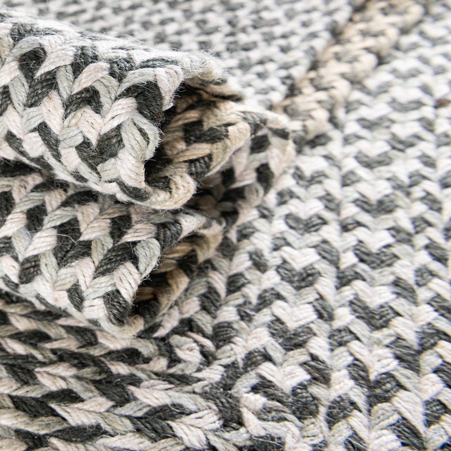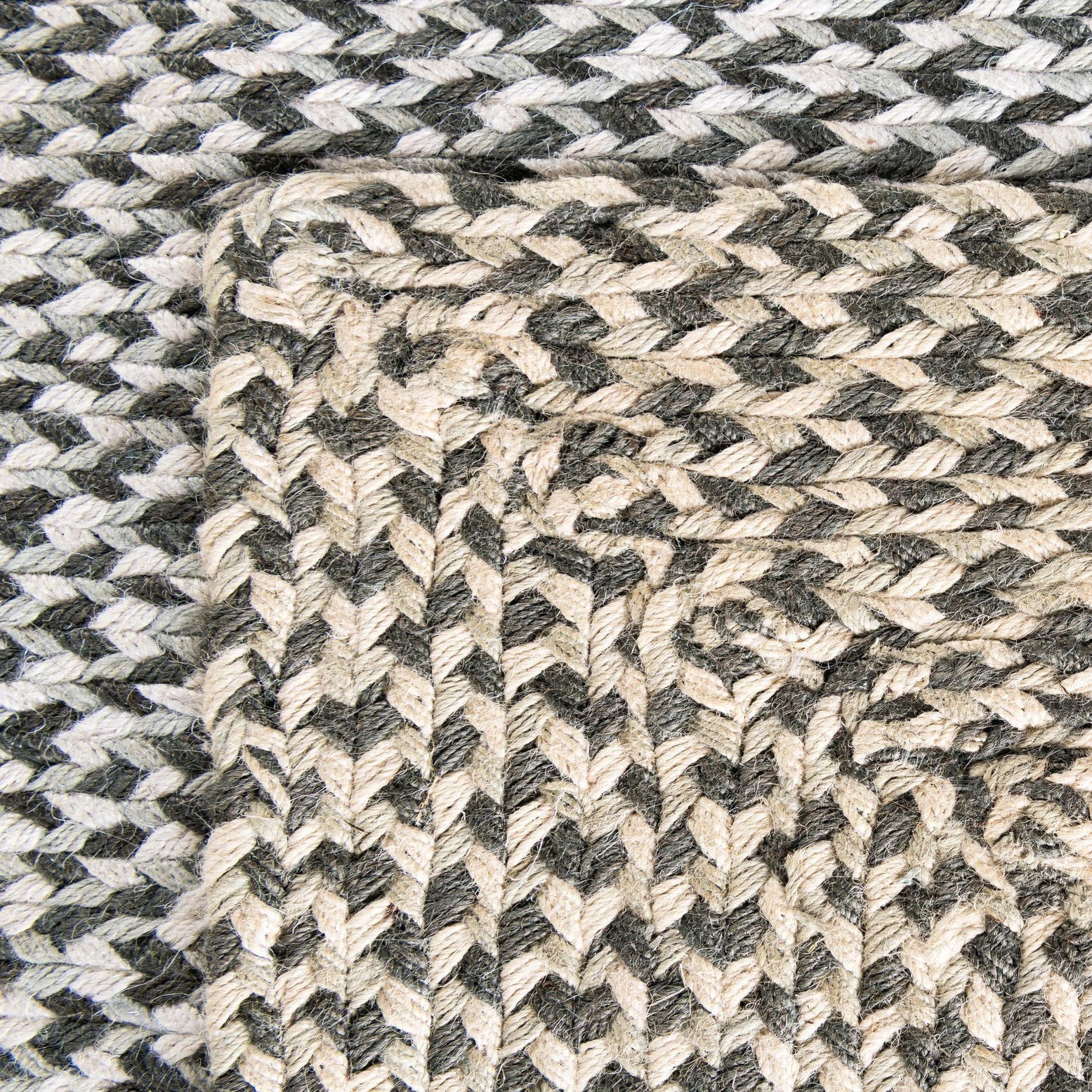 Hand-braided from 100% jute, this square rug presents a tweed-like braid in a gray background woven with ivory strands for a soft two-tone effect. The braiding is arranged into a stepped, concentric-square motif that gives the surface a subtle geometric rhythm. Running your hand over it reveals the natural, slightly coarse texture of jute and the low-profile braided ridges that add tactile interest without a thick pile.