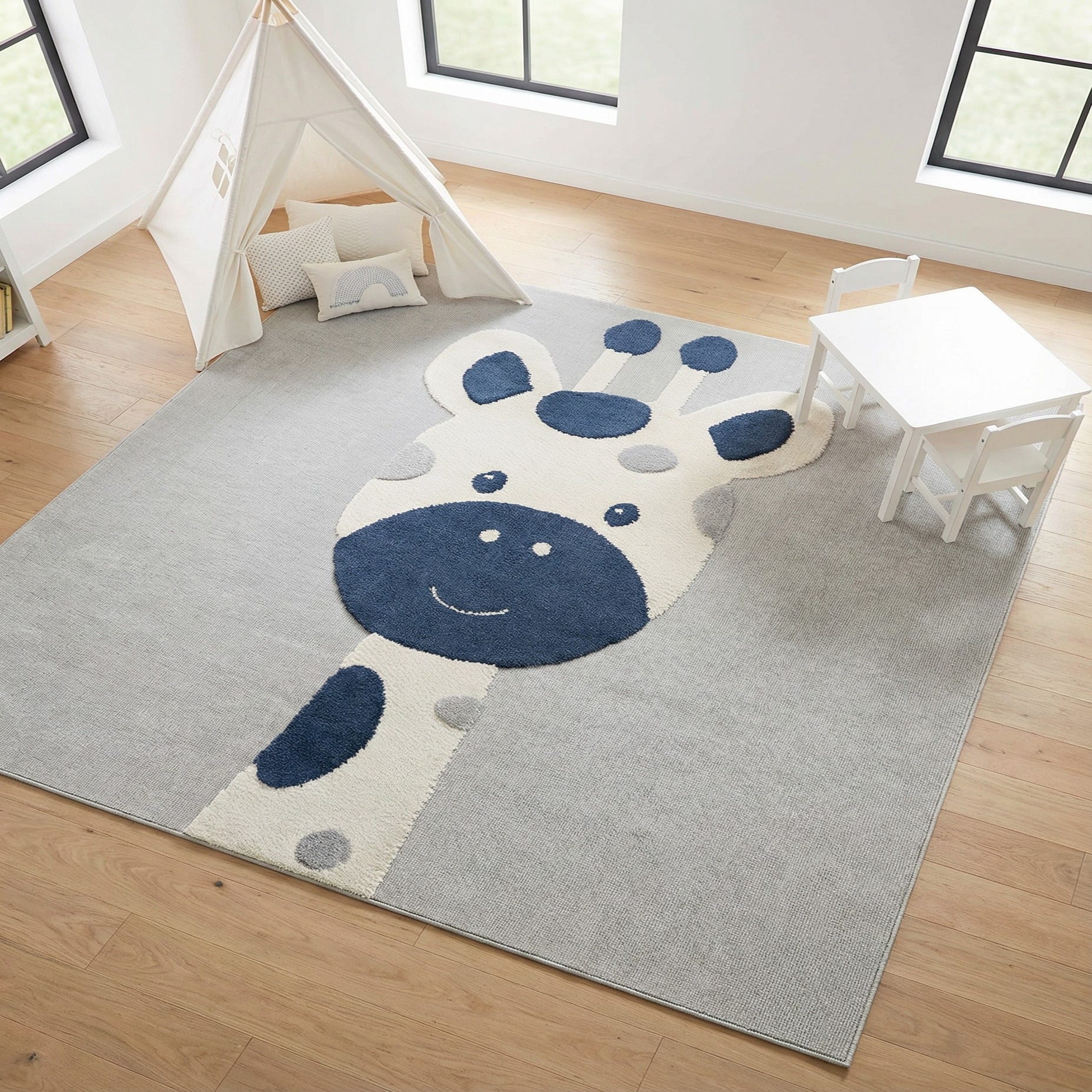 Machine-made of 100% polypropylene, the rug pairs a low, even background with a plusher, cut-pile giraffe motif you can feel beneath your fingertips. That contrast adds gentle dimension while keeping the surface easy to walk and play on. Use this rug to anchor a nursery or playroom, define a reading nook, or layer under a small table in a child’s bedroom; it works well with white or natural wood furniture and navy accent pieces for a coordinated, relaxed look.