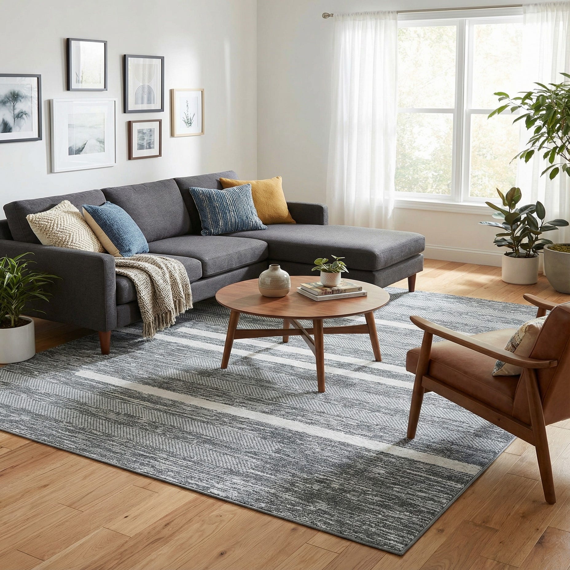 This piece works well under a sofa and coffee table to define a modern living area, layered at the foot of a bed in a serene bedroom, or placed in a home office to add visual interest without overwhelming the space. It pairs naturally with pale woods and cool metal accents, and complements minimalist, Scandinavian, coastal, or transitional interiors where neutral tones and clean lines are preferred.