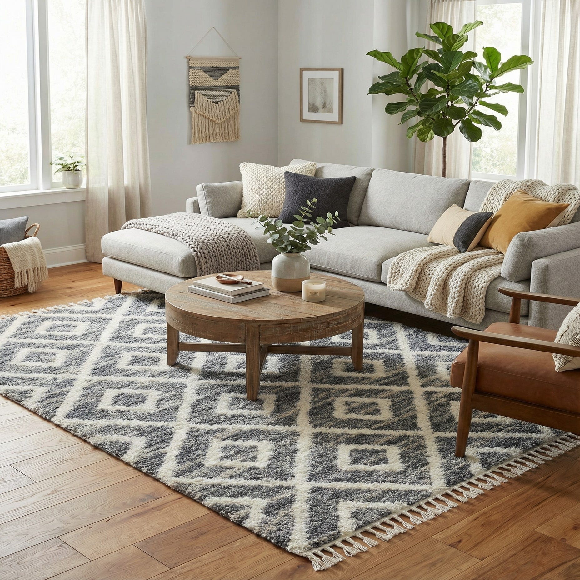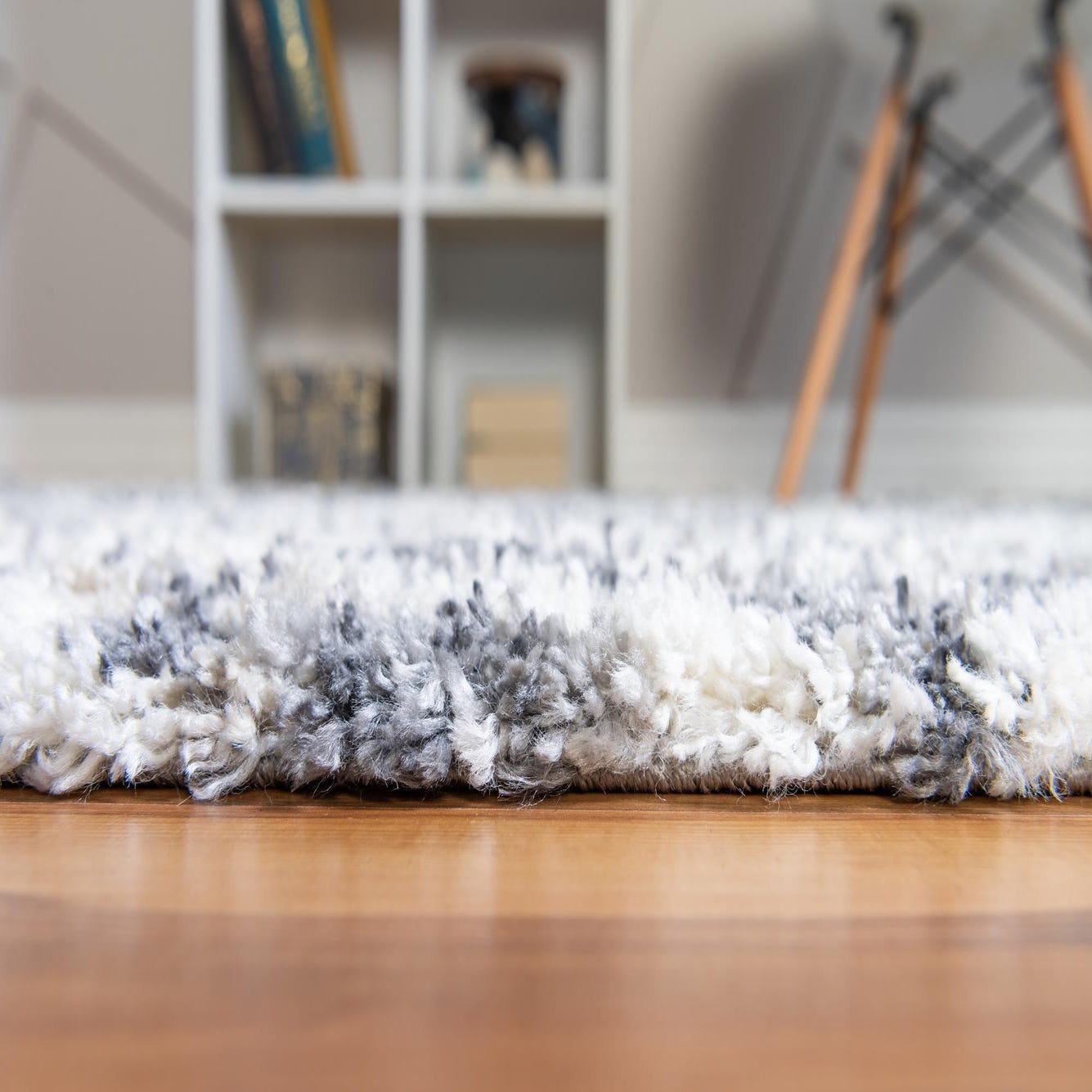 Machine made of 100% polypropylene, this rug combines a cozy shag feel with consistent construction. Its neutral palette and modern geometric motif work well in a relaxed living room to anchor a seating group, layered in a bedroom for added softness beside the bed, or in a reading nook to bring warmth and pattern to the floor. Pair it with warm wood furniture, neutral upholstery in ivory or charcoal, and textured throws or pillows to complement the gray, beige, and ivory tones.