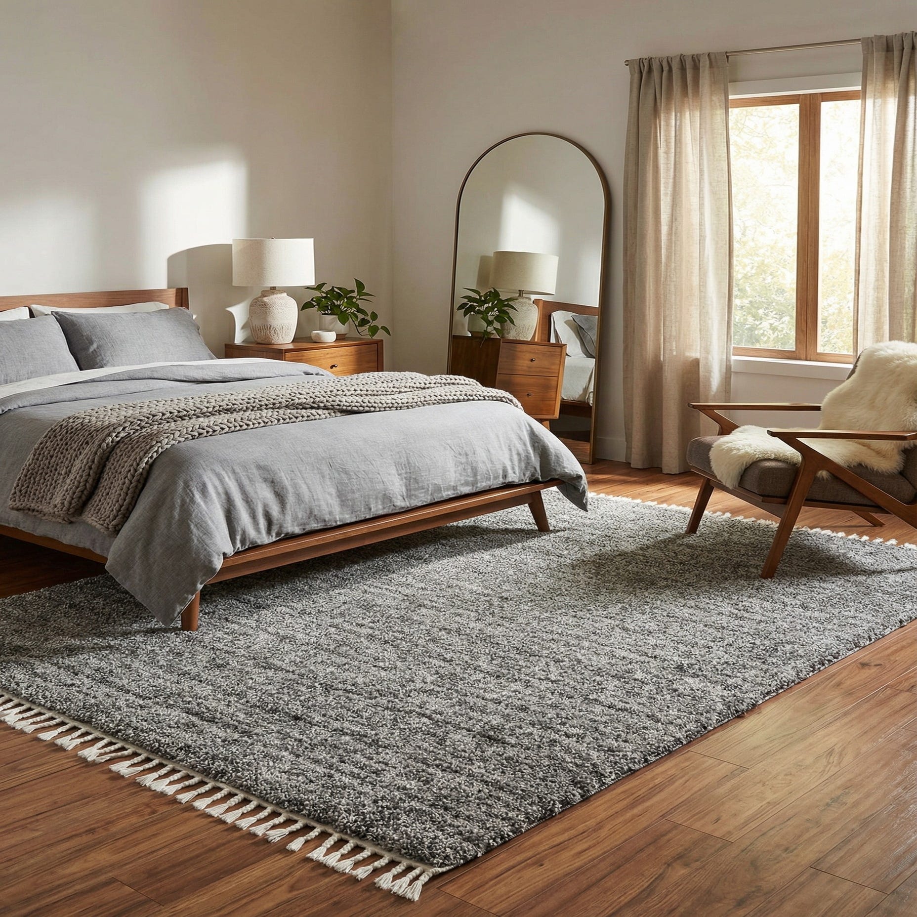 Works well under a low-profile sofa and coffee table in a contemporary living room, layered at the foot of a bed to add softness to hardwood, or placed in a media room to create a comfortable, inviting floor plane. The neutral palette pairs nicely with cool modern furnishings, Scandinavian-inspired light woods, or a relaxed transitional scheme that mixes metal and natural textures.