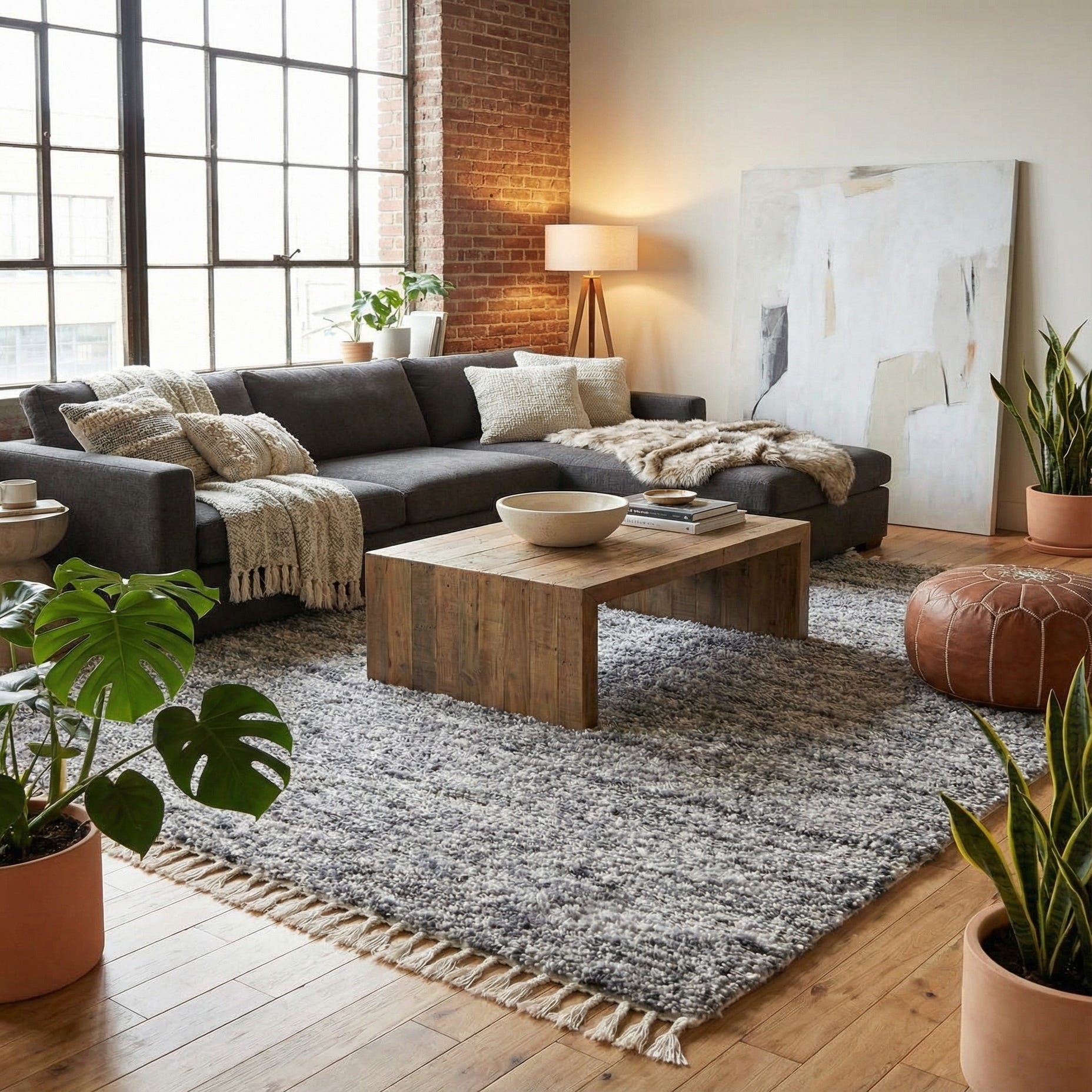 Works well under a low-profile sofa and coffee table in a contemporary living room, layered at the foot of a bed to add softness to hardwood, or placed in a media room to create a comfortable, inviting floor plane. The neutral palette pairs nicely with cool modern furnishings, Scandinavian-inspired light woods, or a relaxed transitional scheme that mixes metal and natural textures.