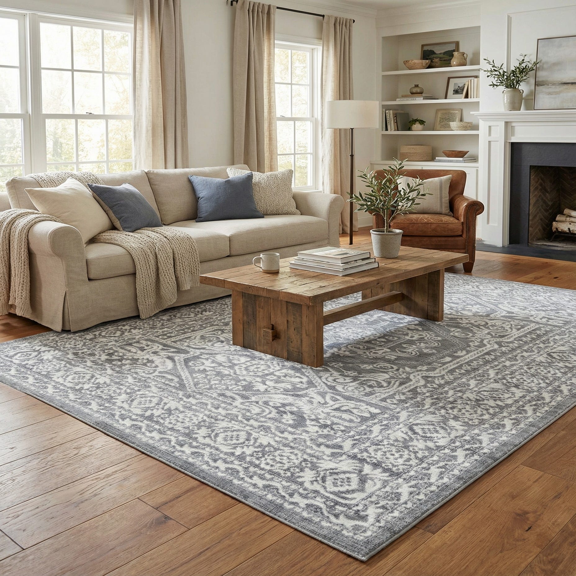 This rug works well as an anchor in a transitional living room, beneath a coffee table to ground seating, or under a dining table where its neutral tones complement wood or metal chairs. In a bedroom, it brings understated pattern to a calm, layered scheme; in an entry or hallway it provides a composed, classic backdrop that pairs easily with cool-toned furnishings, soft linens, and mixed-metal accents. The gray ground keeps the look calm and contemporary while the ivory design introduces texture and traditional interest.
