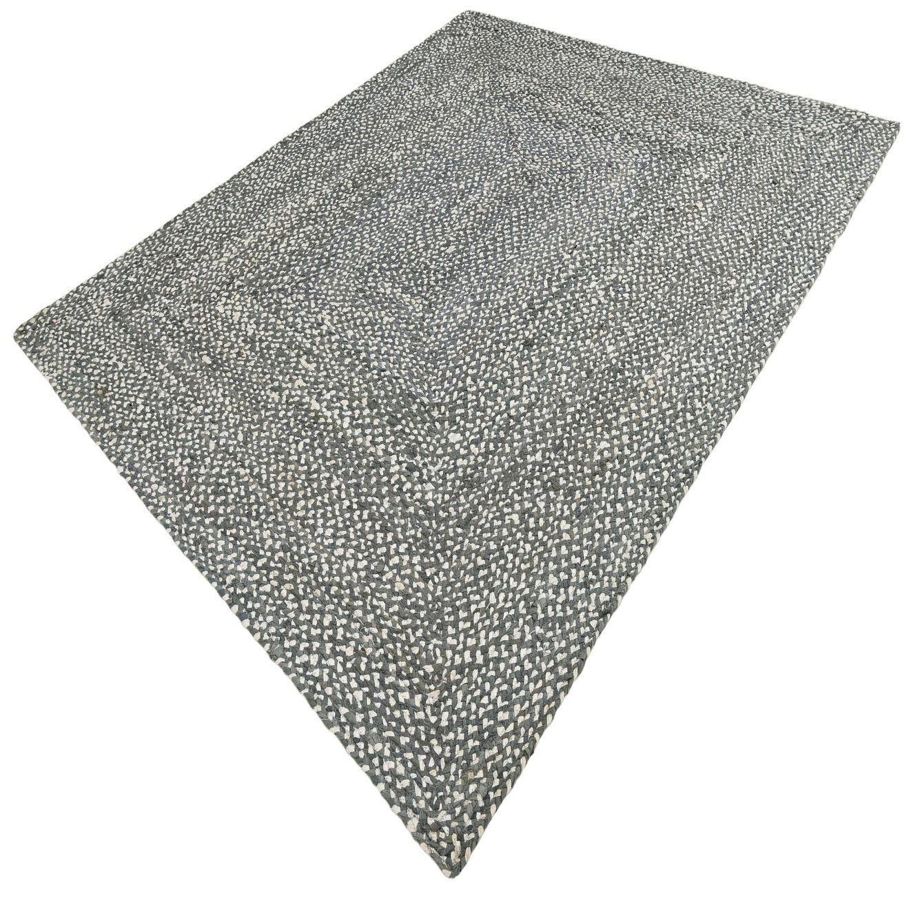 Hand-braided from 100% cotton, this rug presents a structured, rectangular braided pattern with concentric bands that form a subtle framed layout. The gray background is interwoven with ivory strands, creating a soft, salt-and-pepper effect that adds depth without a bold contrast. The braided surface has a low, nubby texture that feels soft underfoot while offering a tactile, natural presence and a matte finish that complements casual and refined settings alike.